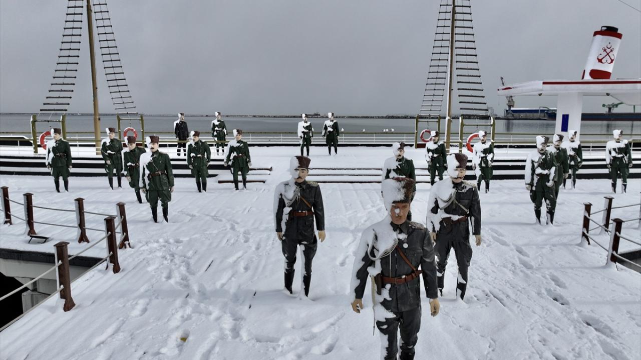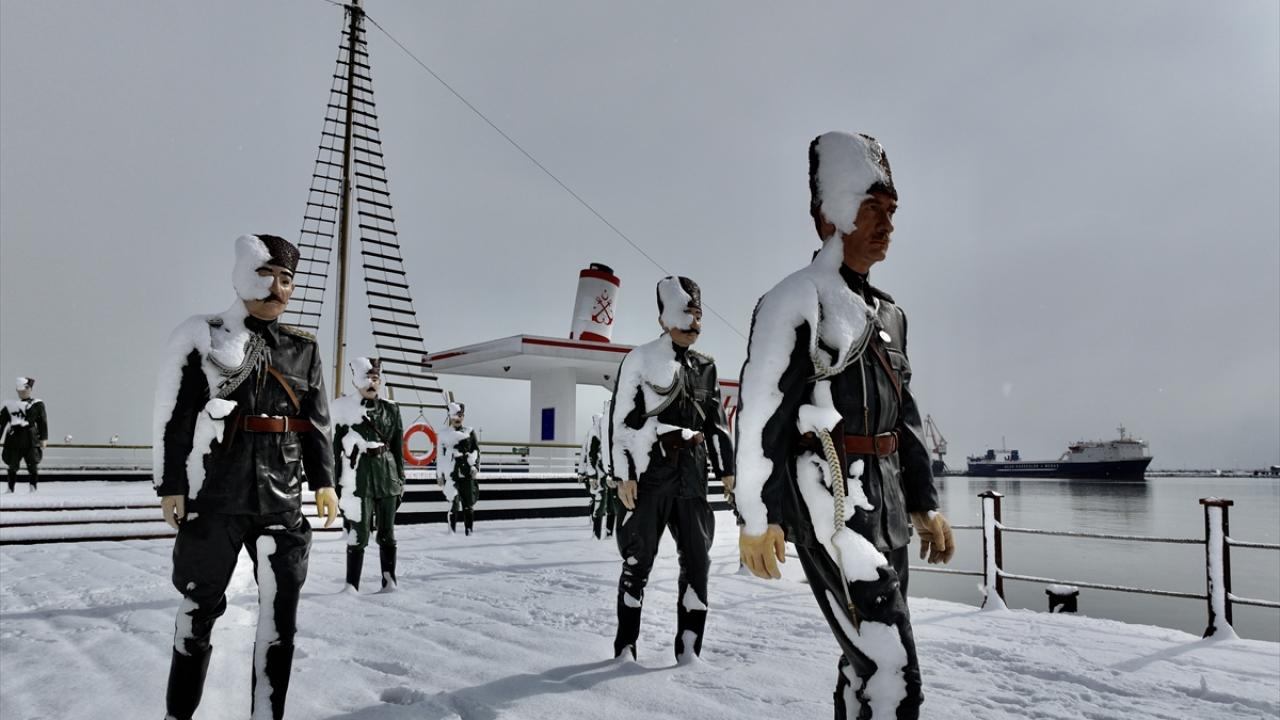Samsun`un simgelerinden olan ve Gazi Mustafa Kemal Atatürk ile 18 silah arkadaşının bal mumu heykelinin bulunduğu Tütün İskelesi, kar yağışıyla beyaza büründü.