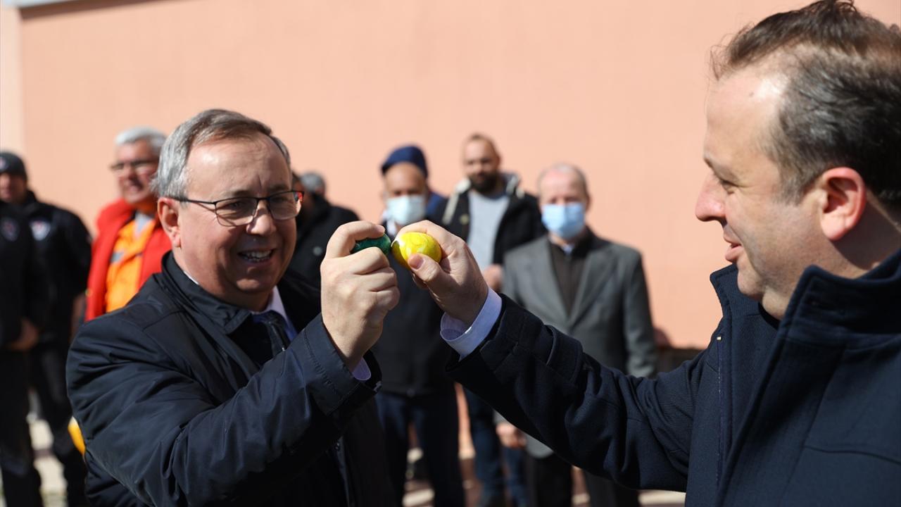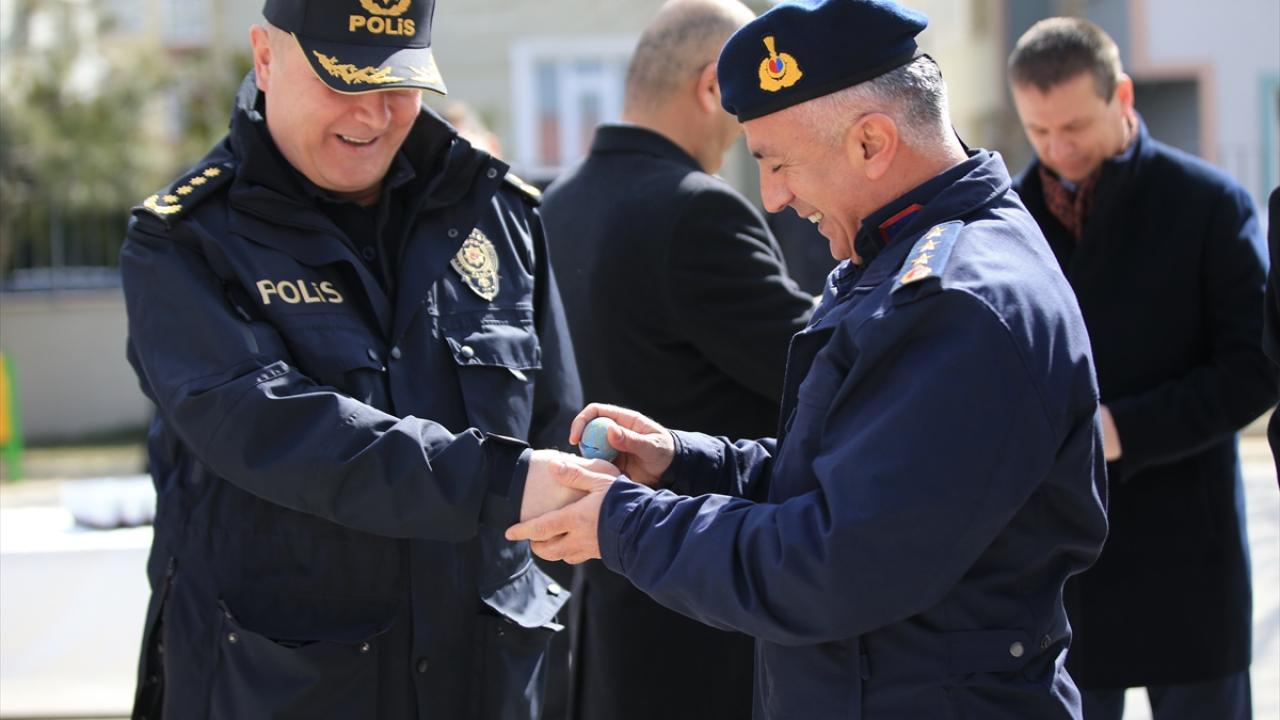Trakya Üniversitesindeki kutlamada, Rektör Prof. Dr. Erhan Tabakoğlu (solda) ve Rektör Yardımcısı Prof. Ahmet Hamdi Zafer, yumurta tokuşturdu.