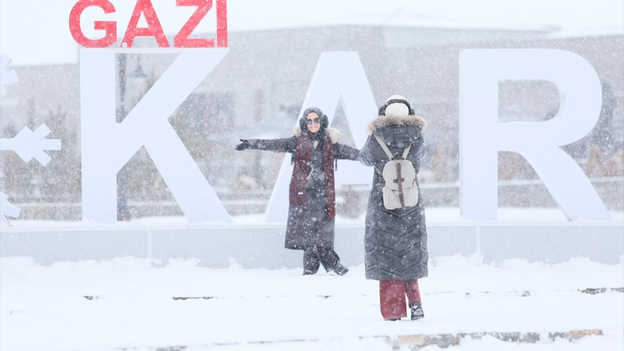 Kars`ta etkili olan kar yağışının ardından kent merkezi beyaza büründü.