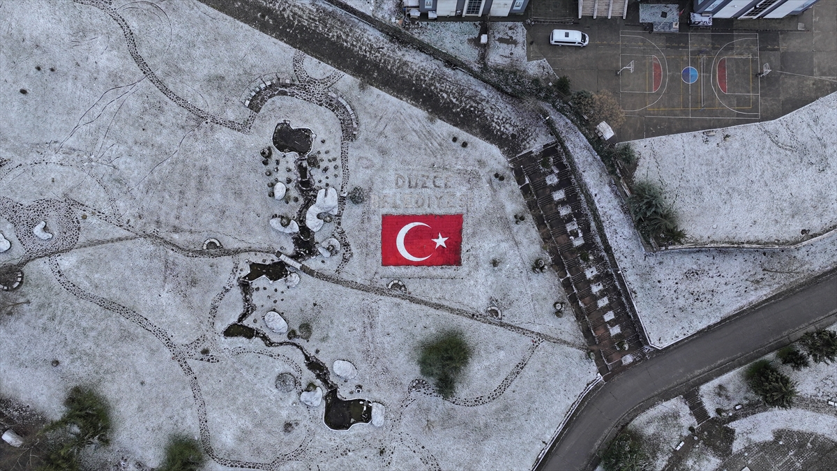 Düzce`de etkili olan kar yağışının ardından kent merkezi beyaza büründü.