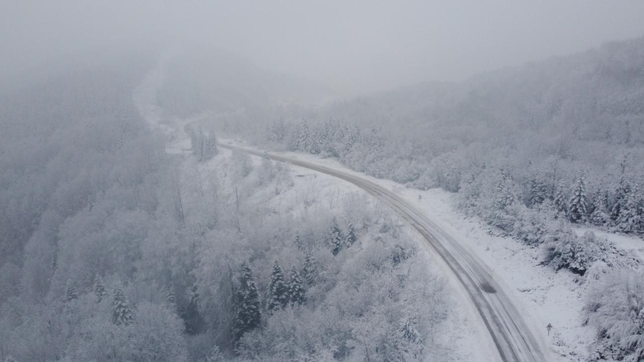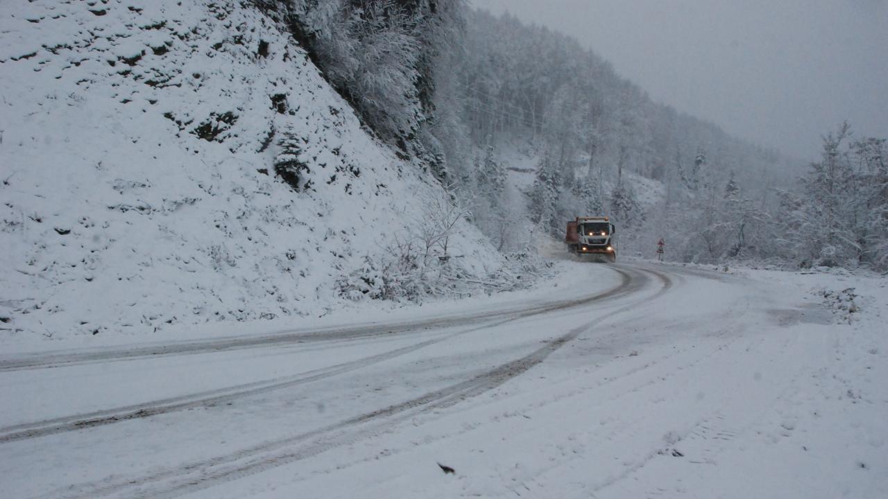 Kar kalınlığının yer yer 15 santimetreyi geçtiği güzergahta, kara yolları ekipleri karla mücadele çalışması yürütüyor.
