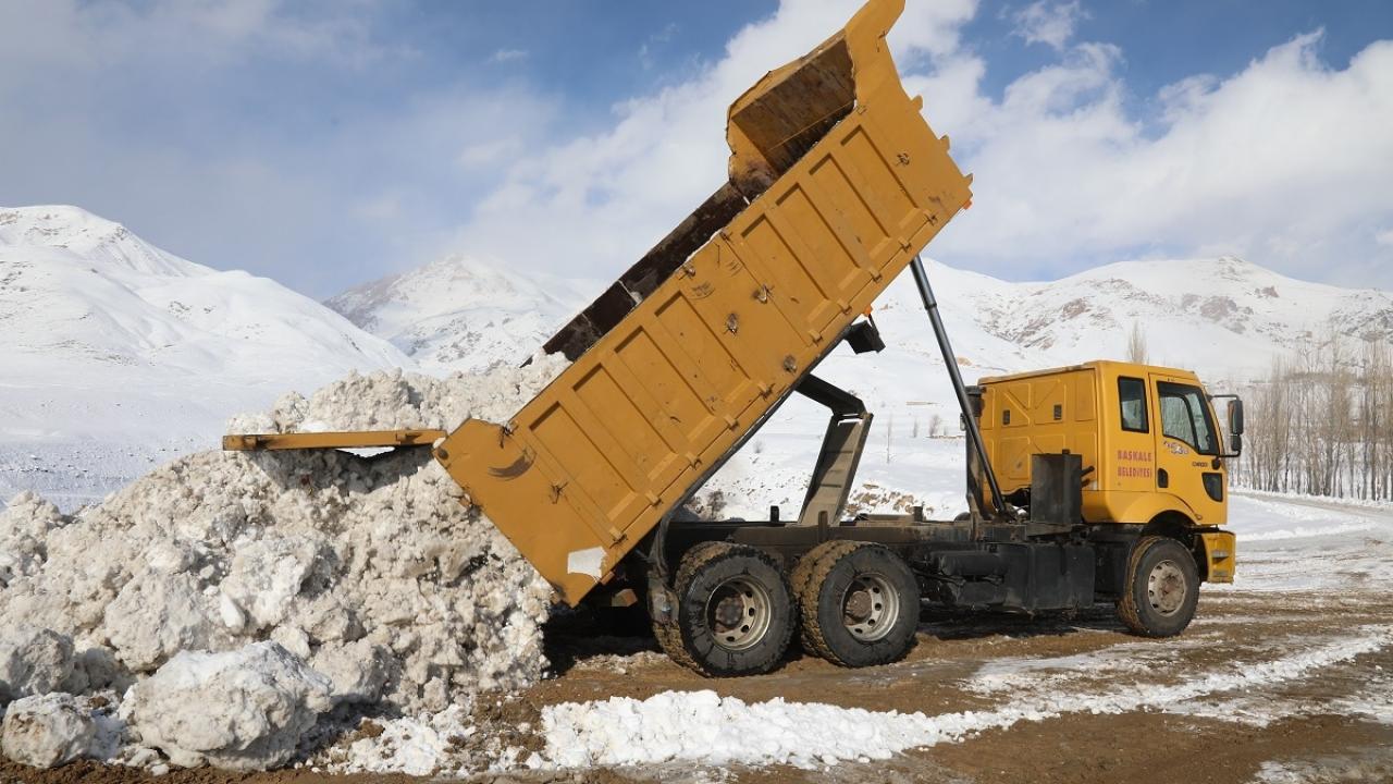 Van’ın Başkale ilçesinde kaldırım ve yollarda biriken karlar, kamyonlarla yerleşim yerinin dışına taşınıyor.