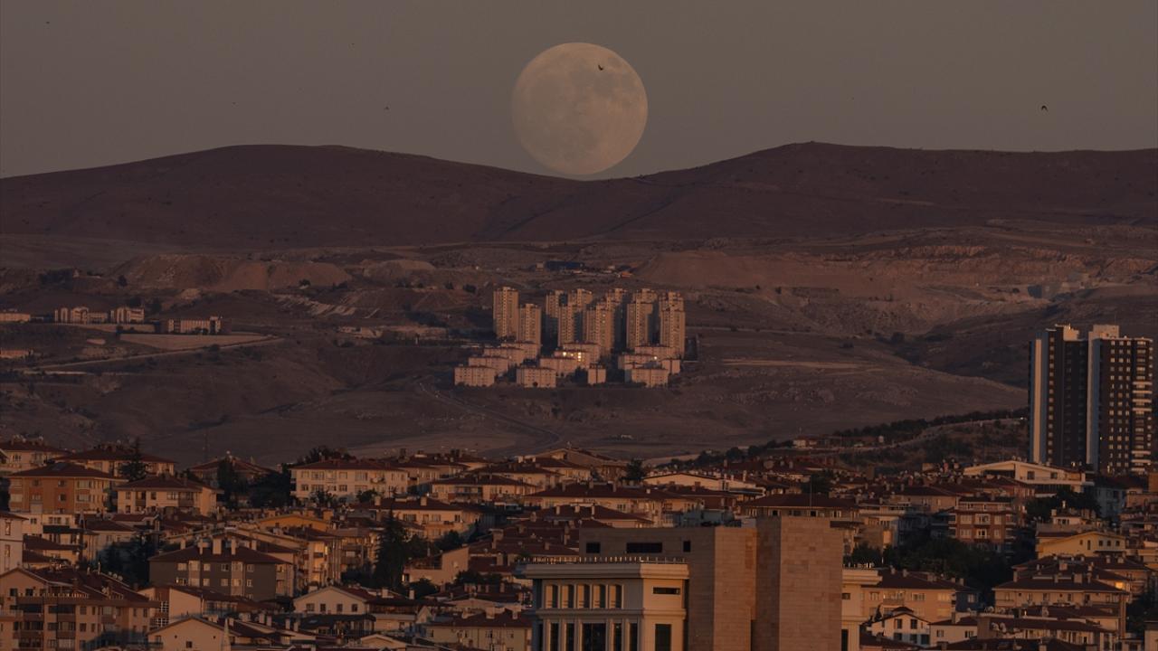 Başkentte gün batımı esnasında gökyüzünde beliren dolunay, Ankara Kalesi ile görüntülendi.