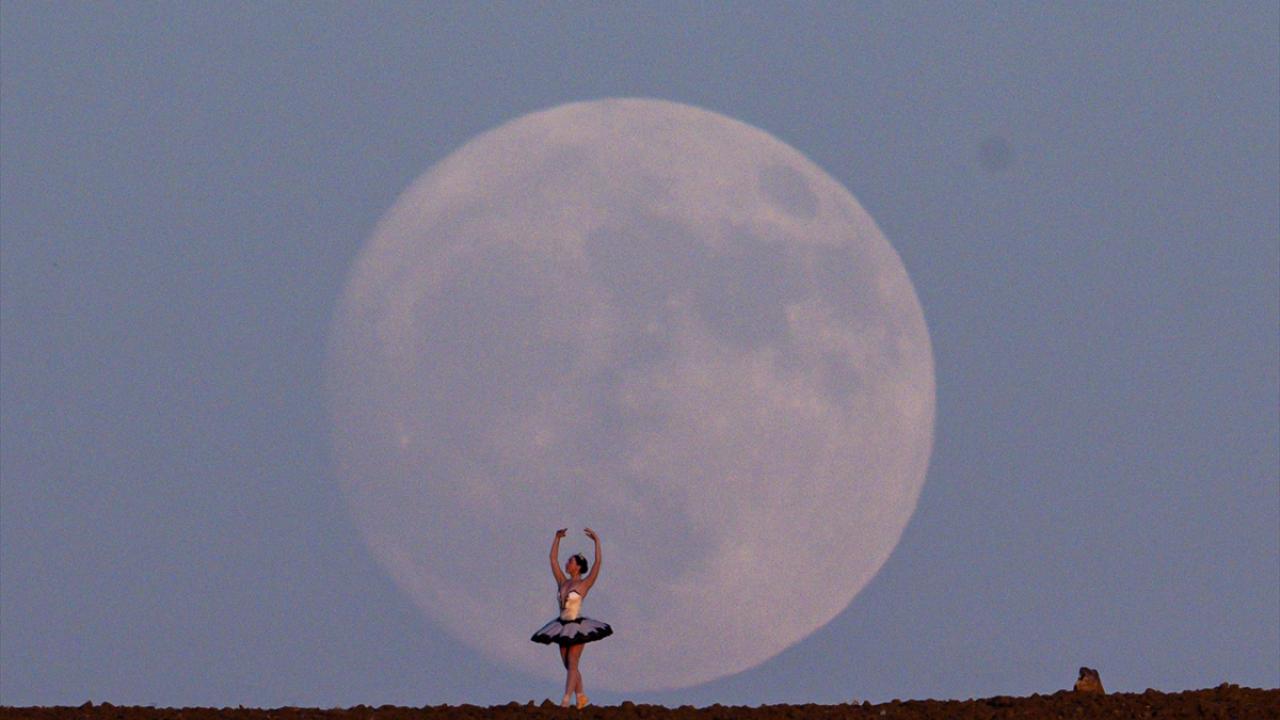 Ankara`da dolunay dağların ardından yükselirken, balerin Doğa Deniz Usta performans sergiledi.