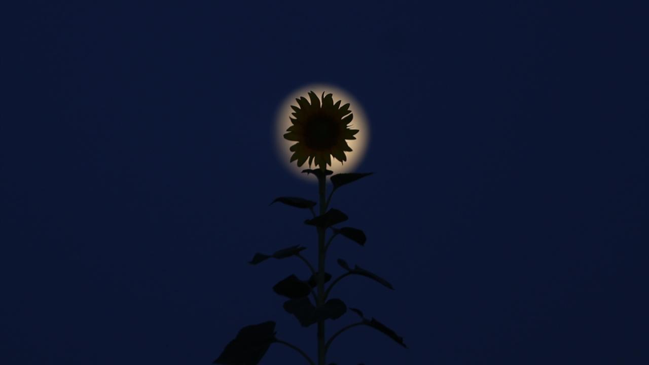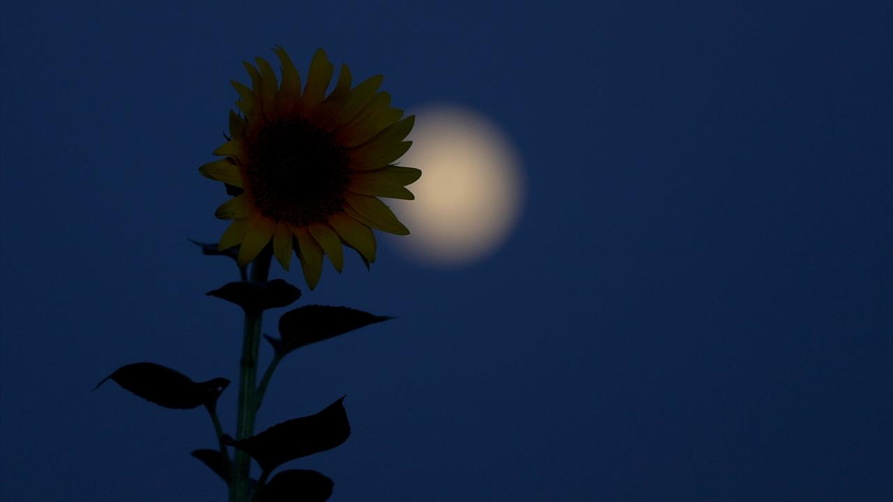 Kırklareli`nde akşam saatlerinde gökyüzünde beliren dolunay ayçiçeği tarlaları ile güzel görüntü oluşturdu.