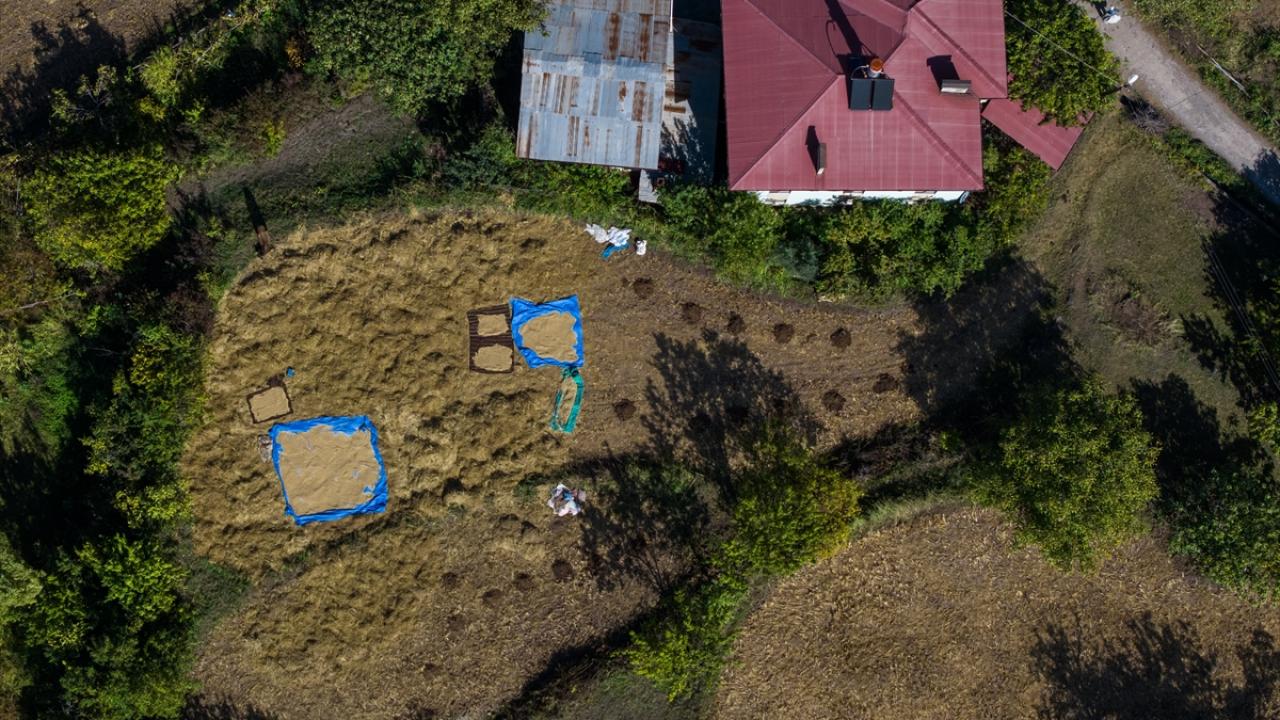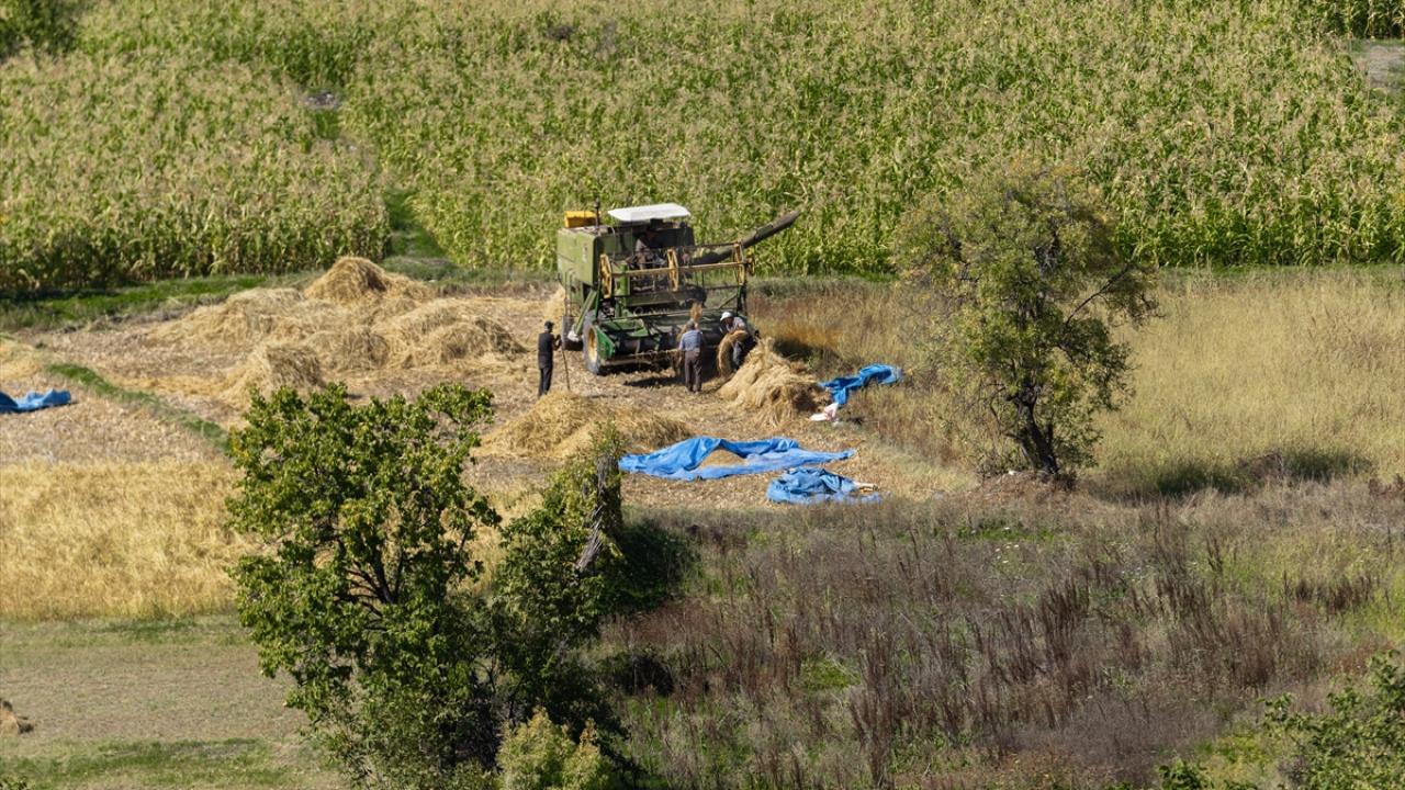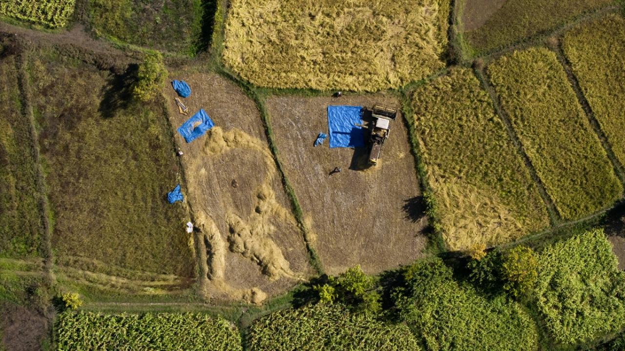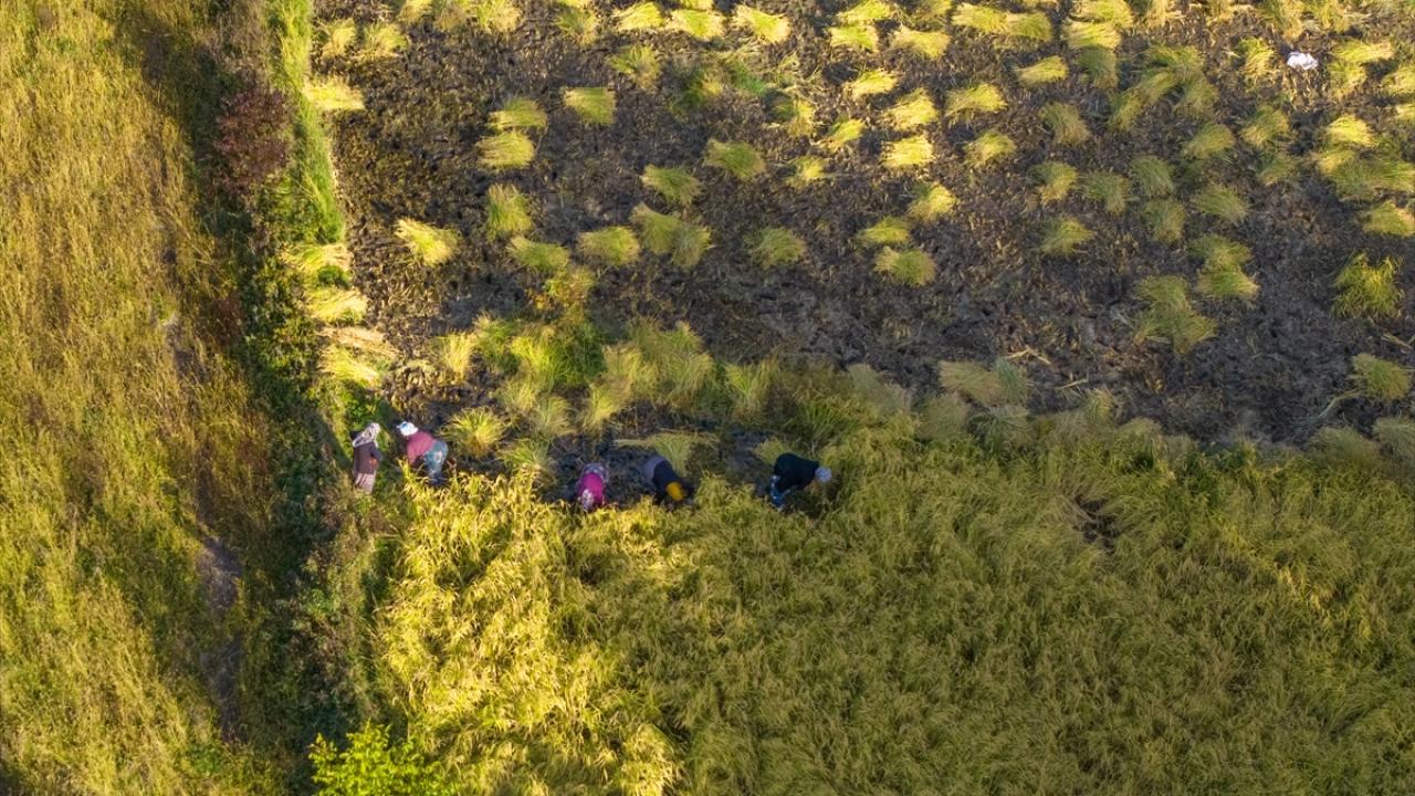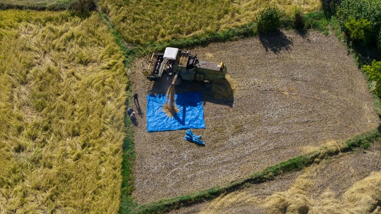 Modern biçerdöverlerin yanı sıra geleneksel yöntemlerin de kullanıldığı bölgede, sapları kesilen çeltikler harmanlanarak tanelerinden ayrılıyor ve güneşte kurutuluyor.