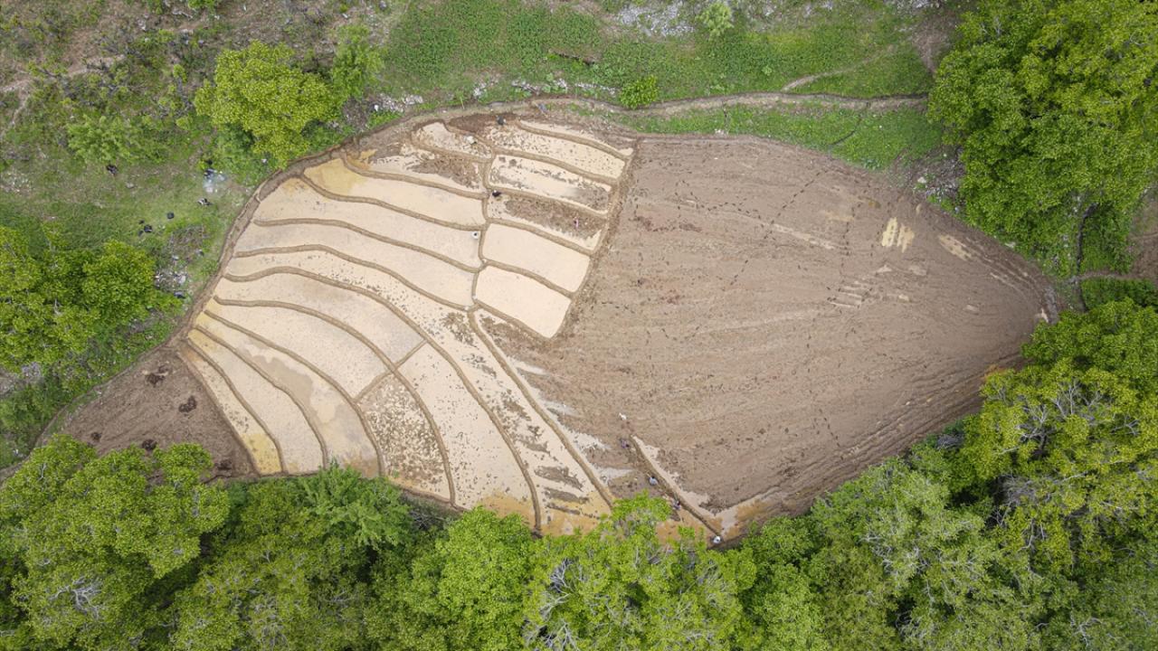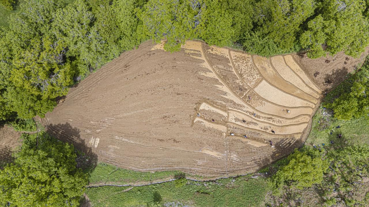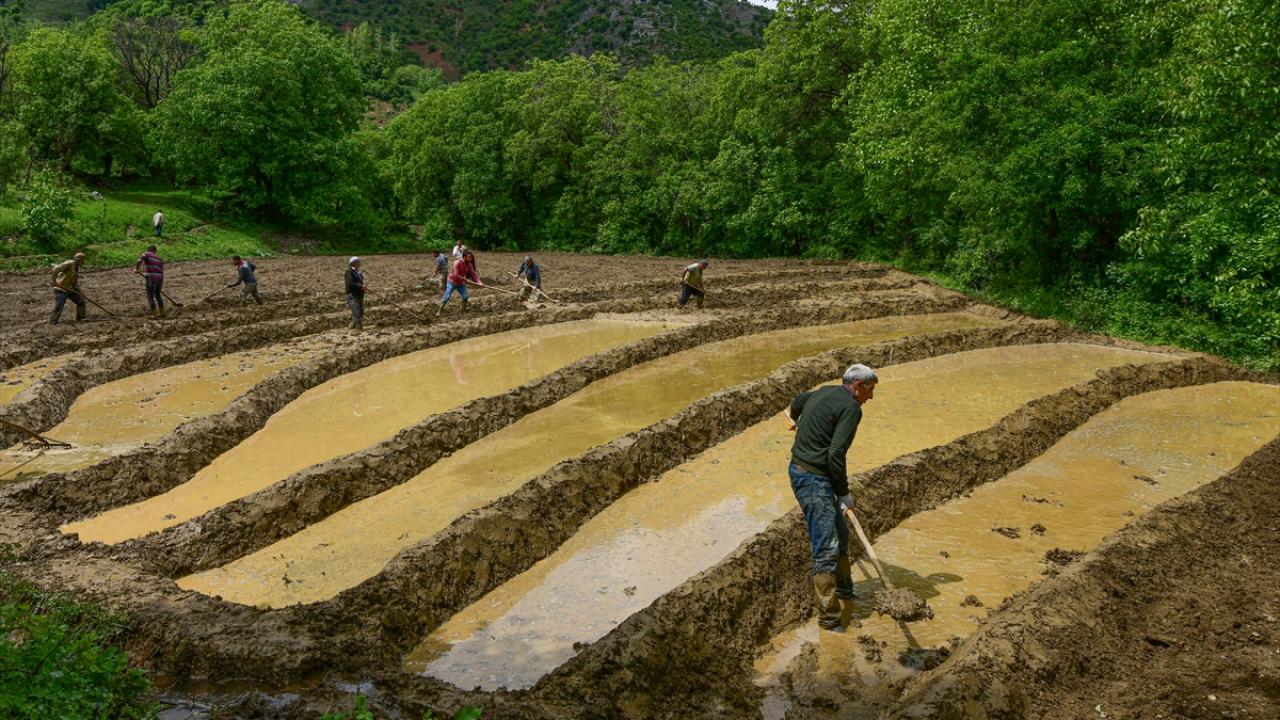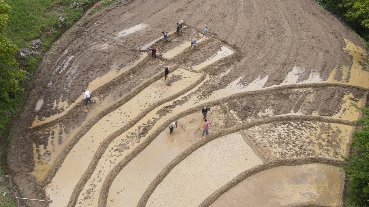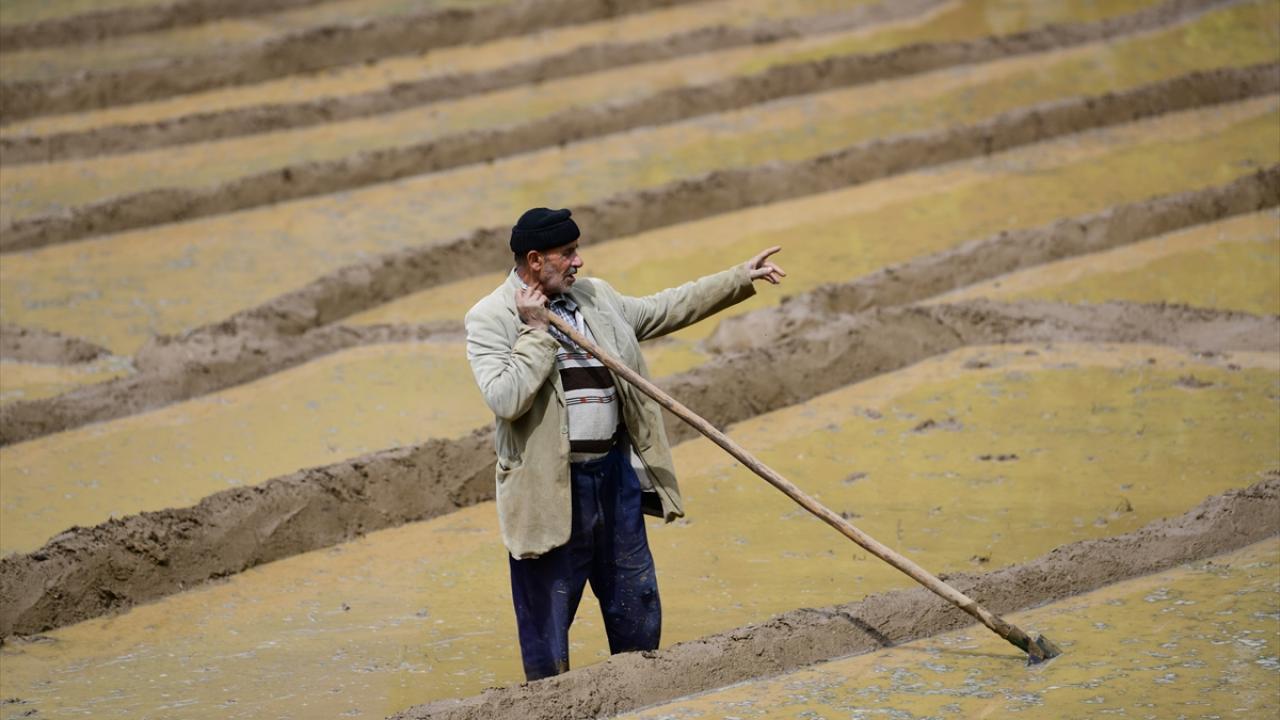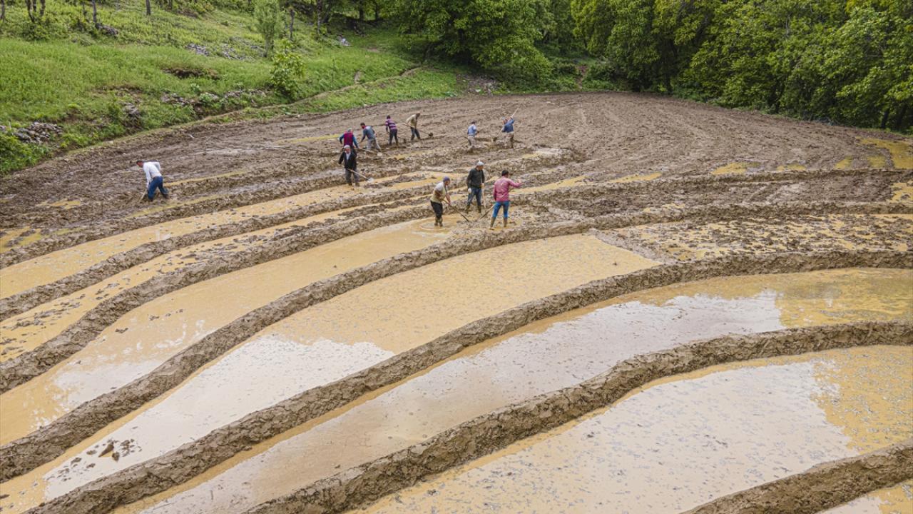 Her yıl mayıs ve haziran aylarında arazilerine çeltik ekimi yapmak için bir araya gelen köylüler imece usulü ile ekim yapıyor.