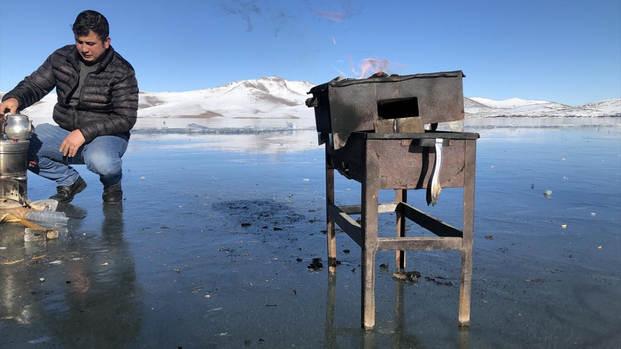 Iğdır`dan gelerek gölün buzla kaplı yüzeyinde mangal yapan ziyaretçilerden Vahap Arslan, doğada olmanın kendileri için bir tutku olduğunu belirtti.