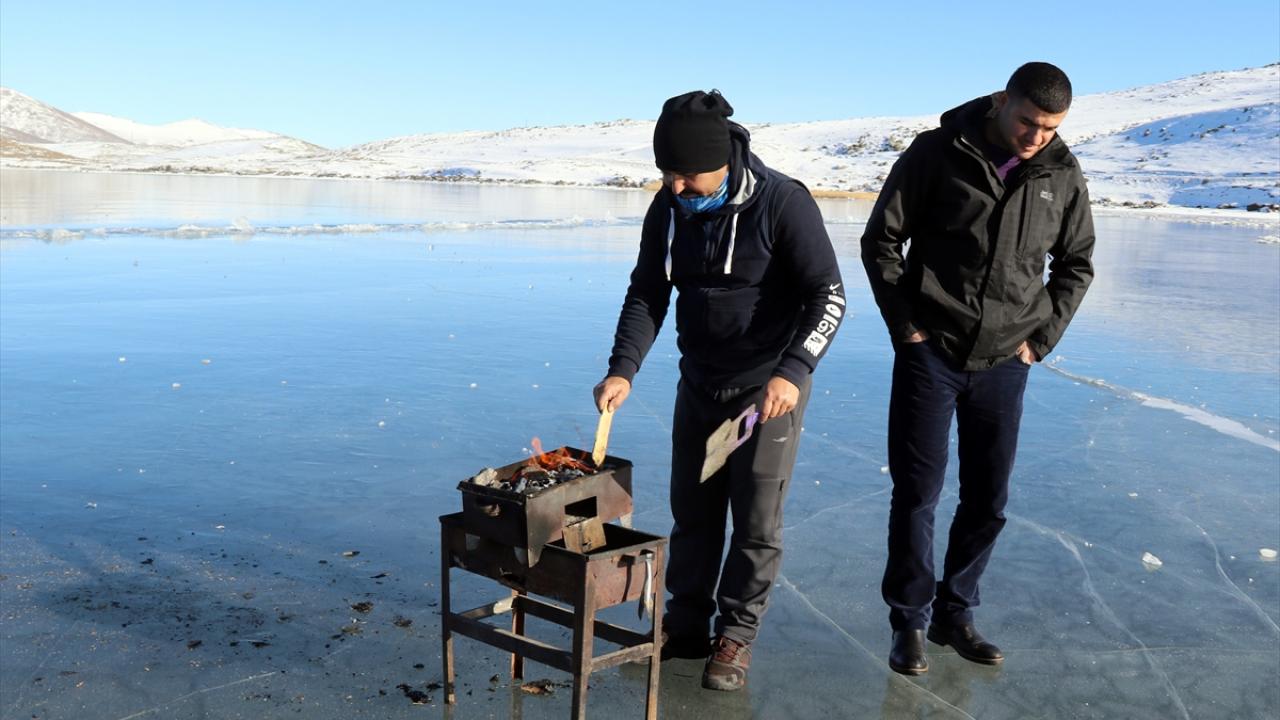 Bazı vatandaşlar gölün buzlu yüzeyinde yürüyüş yaparken, bazıları ise buzla kaplanan göl yüzeyinde mangal yakıp gölün tadını çıkardı.