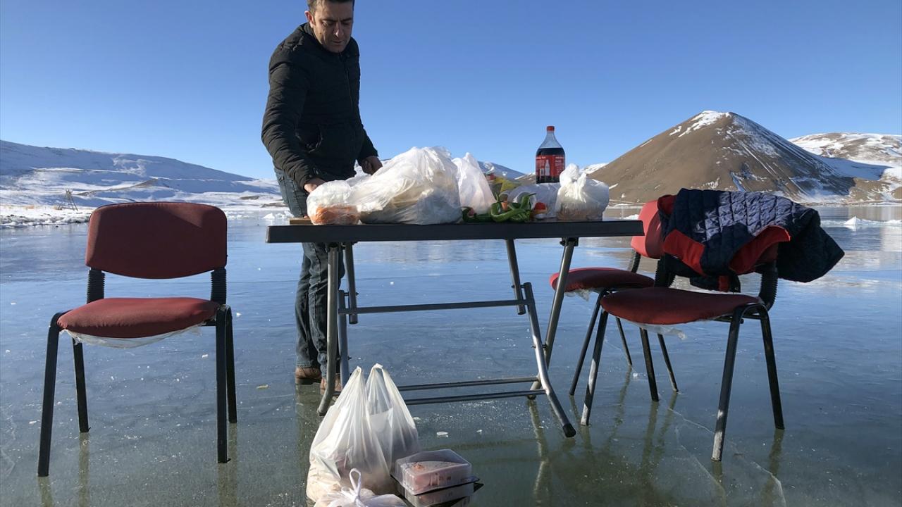 Yüzeyi buz tutan Balık Gölü'nde mangal keyfi yaptılar