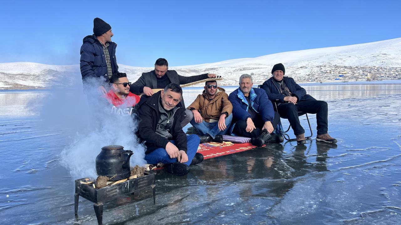 Adnan Genç ise Çıldır Gölü`nün buz tutan yüzeyinde közde çay demleyerek havanın keyfini çıkardıklarını anlattı.