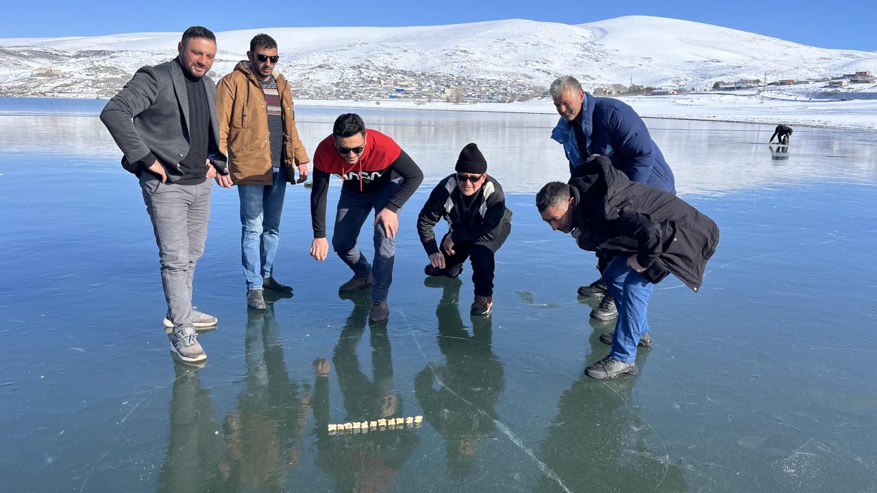 Yüzeyi buz tutan Çıldır Gölü'nde renkli görüntüler