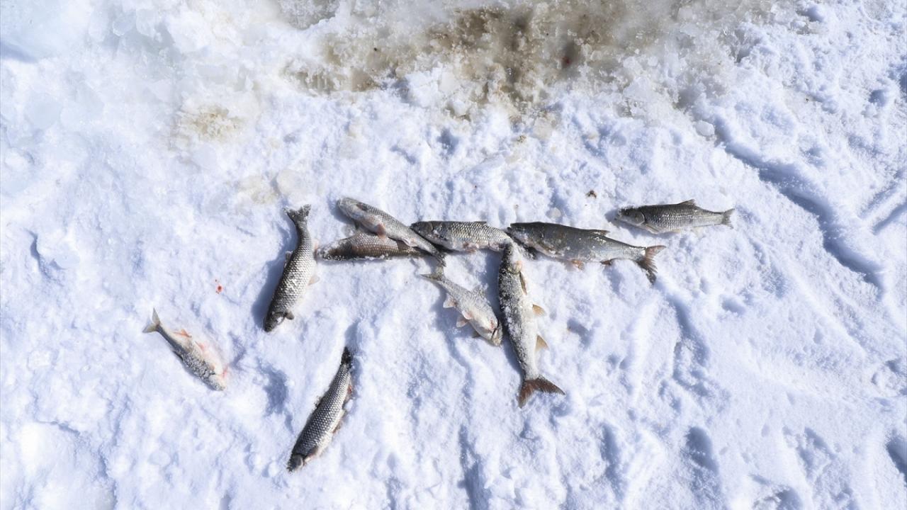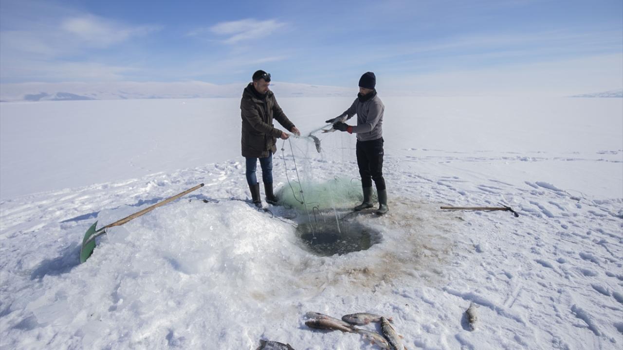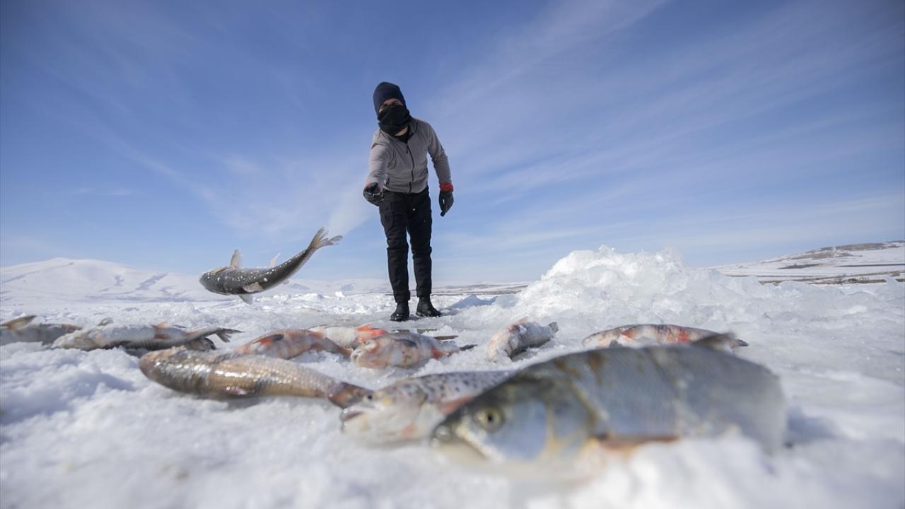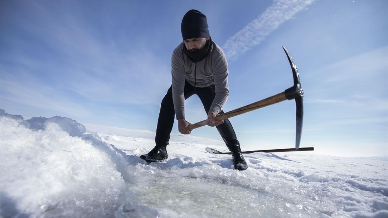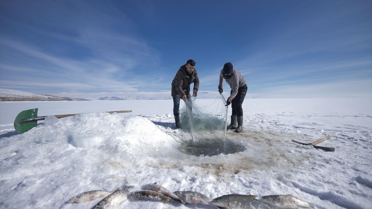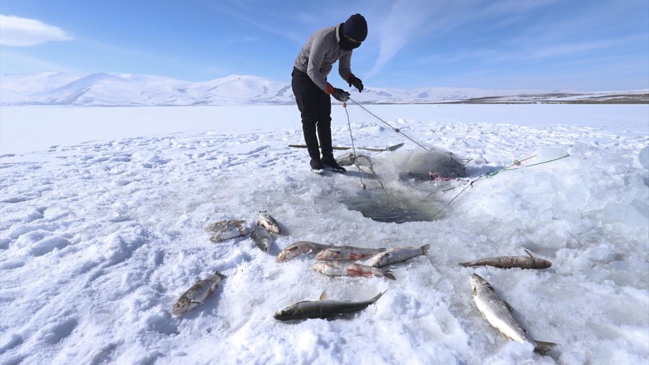 Zorlu koşullarda avlanmaya çalışan balıkçılar, her gün gölün üzerine çıkarak buzu deliyor ve balıkları yakalamak için büyük emek harcıyor.