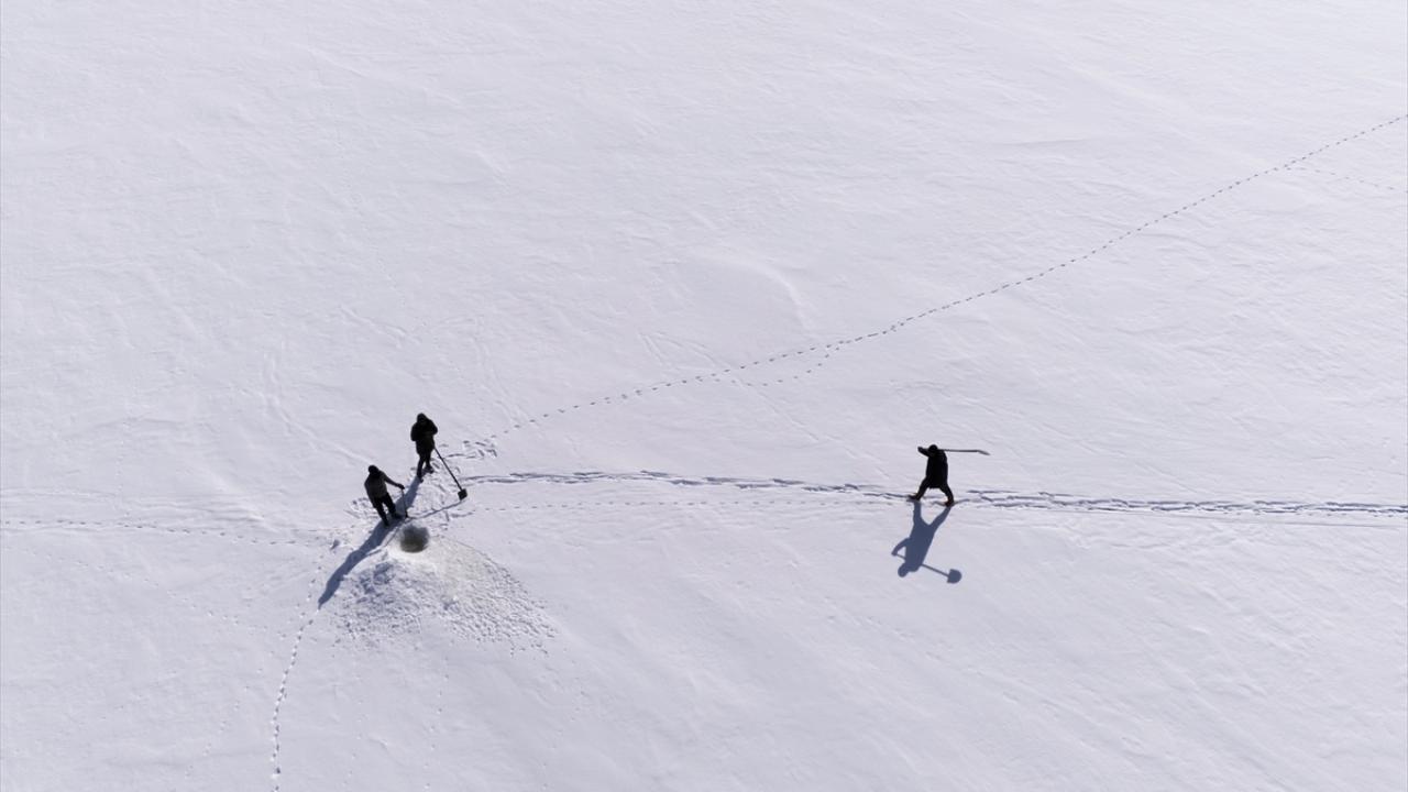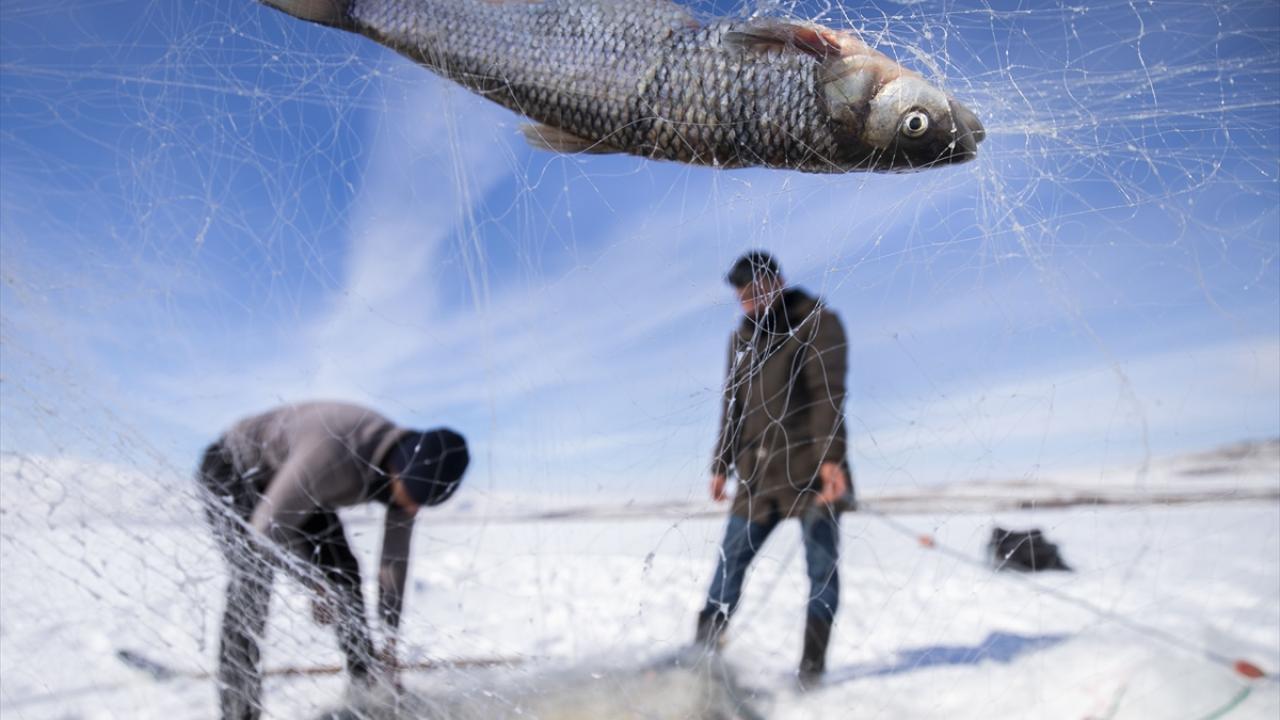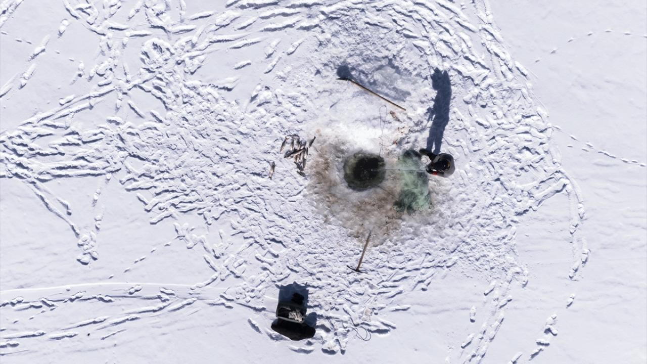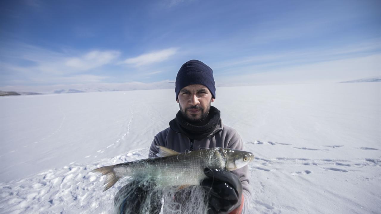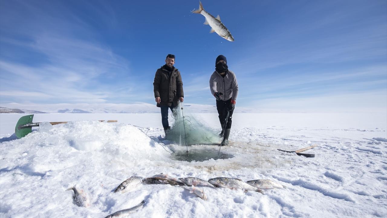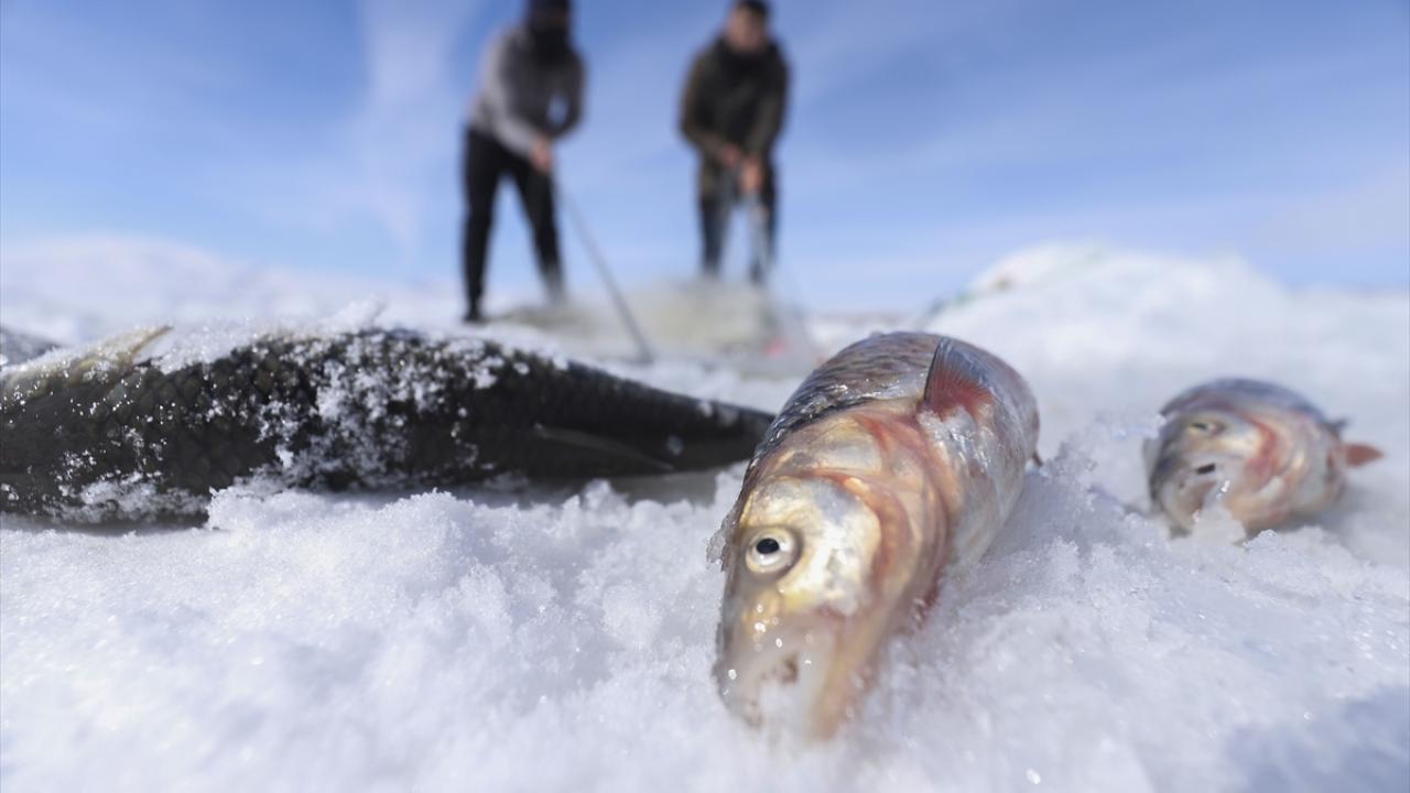 Zorlu koşullarda avlanmaya çalışan balıkçılar, her gün gölün üzerine çıkarak buzu deliyor ve balıkları yakalamak için büyük emek harcıyor.