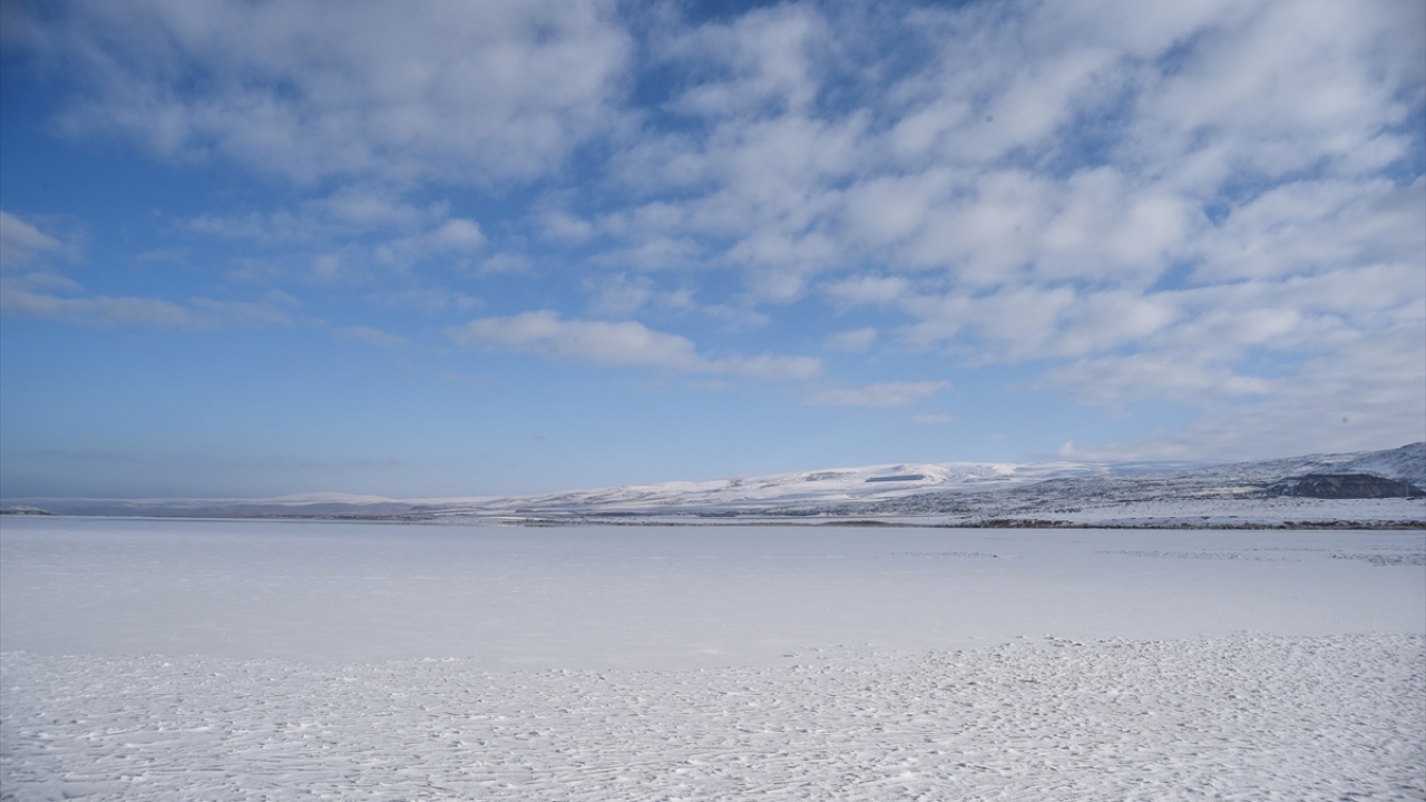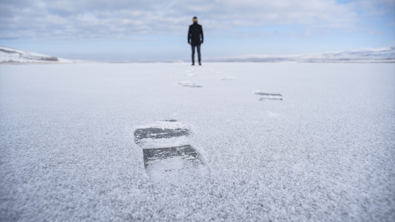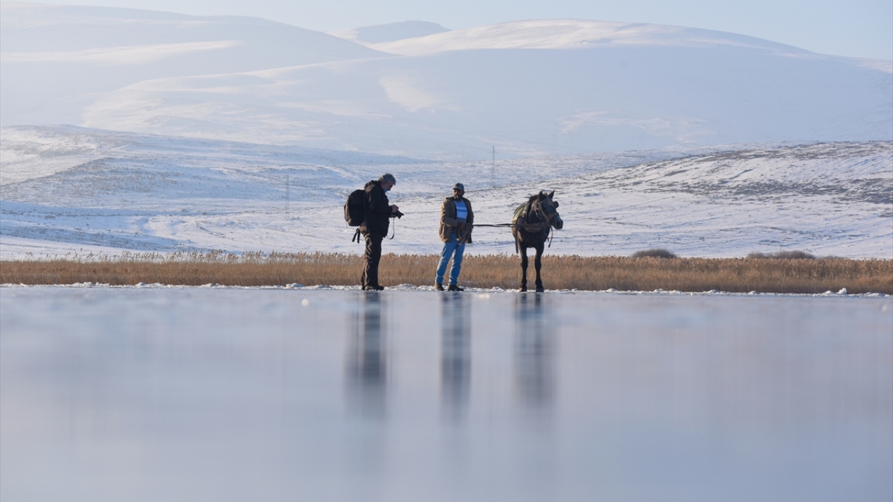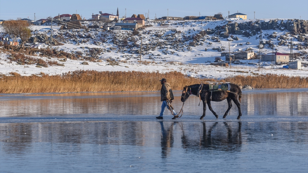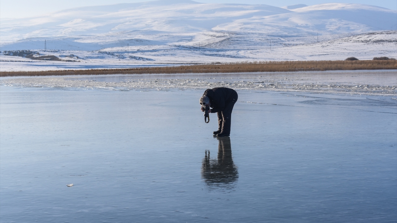 Kars-Ardahan sınırlarındaki, yüzeyinin bir kısmı donan Çıldır Gölü'nde, seyrine doyumsuz manzaralar oluştu.