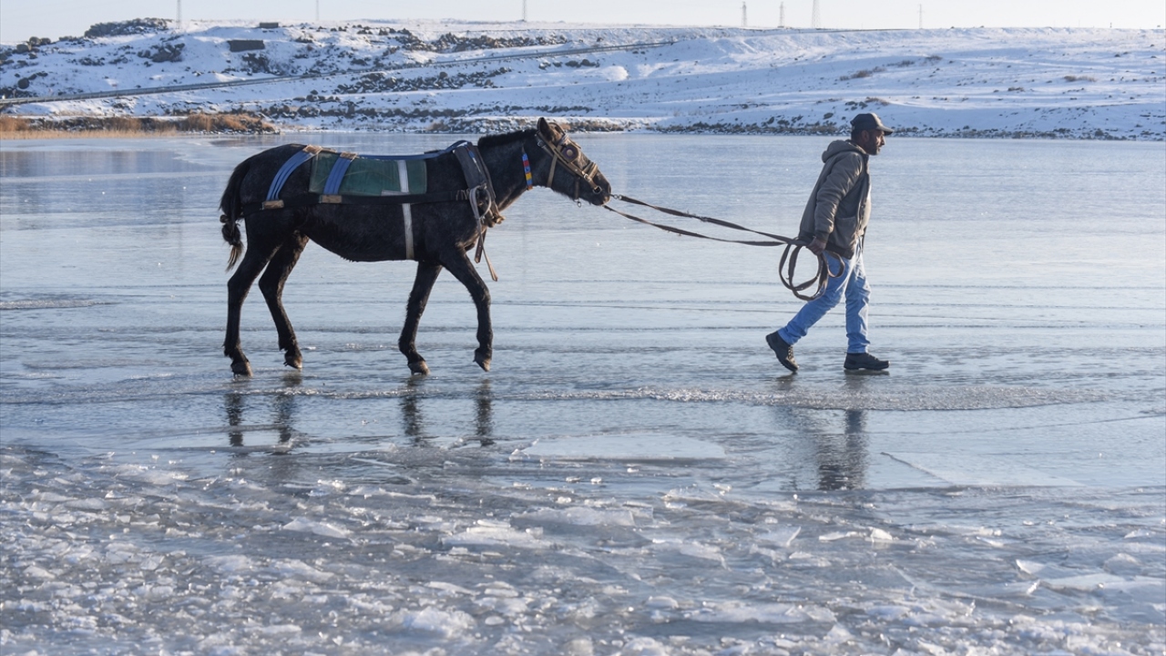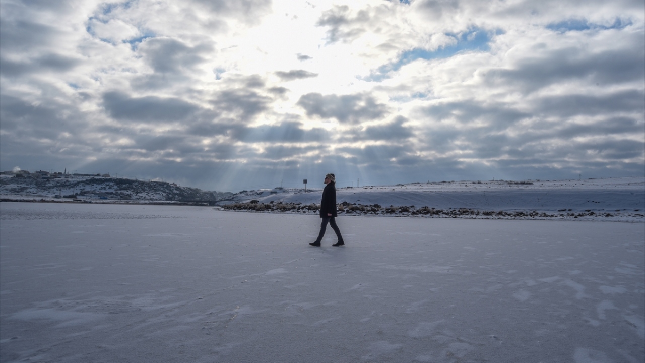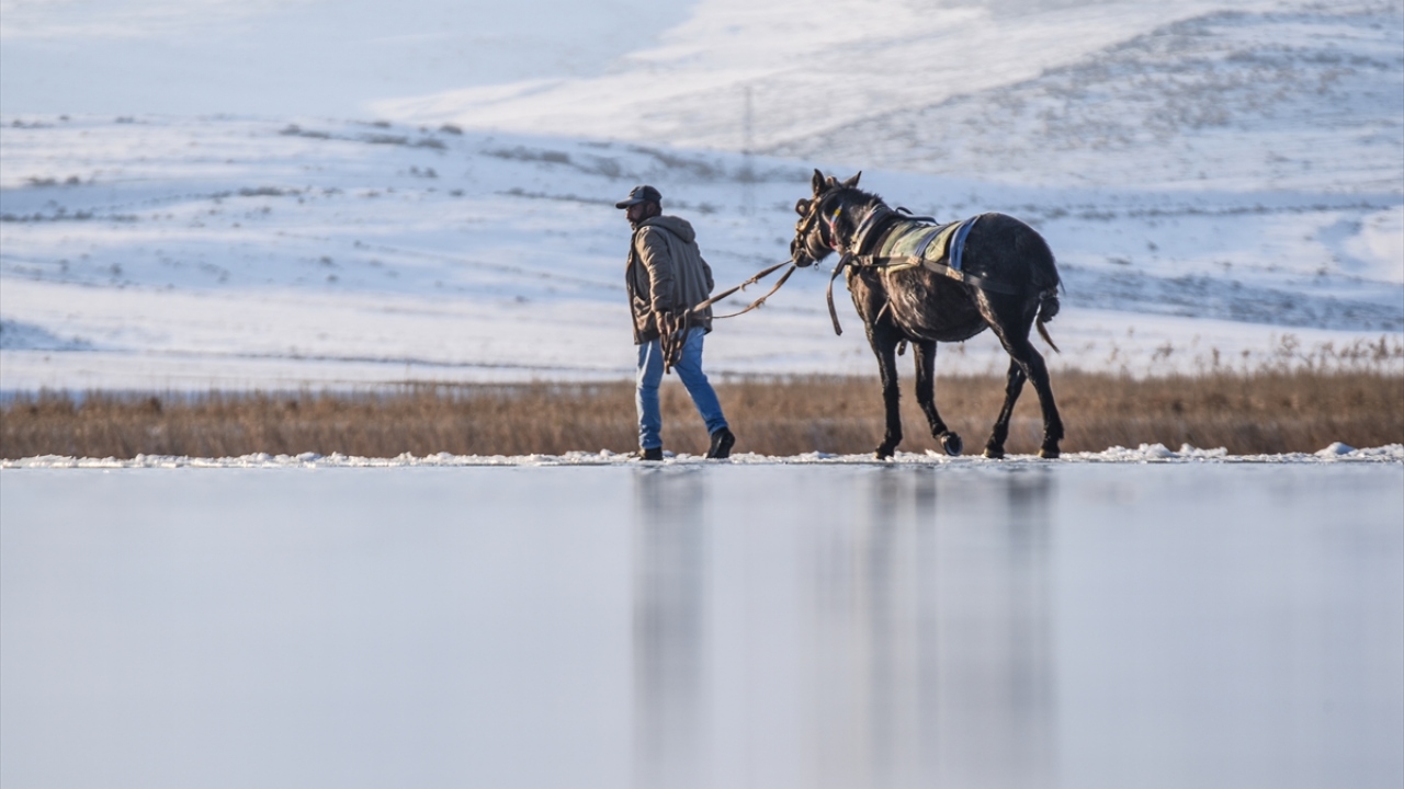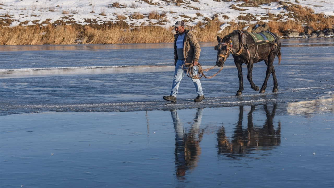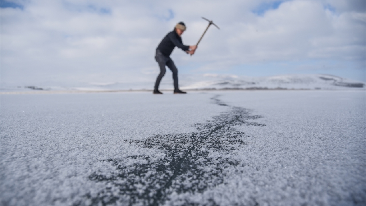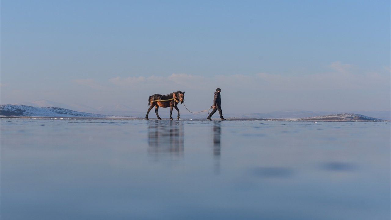 Kars-Ardahan sınırlarındaki, yüzeyinin bir kısmı donan Çıldır Gölü'nde, seyrine doyumsuz manzaralar oluştu.