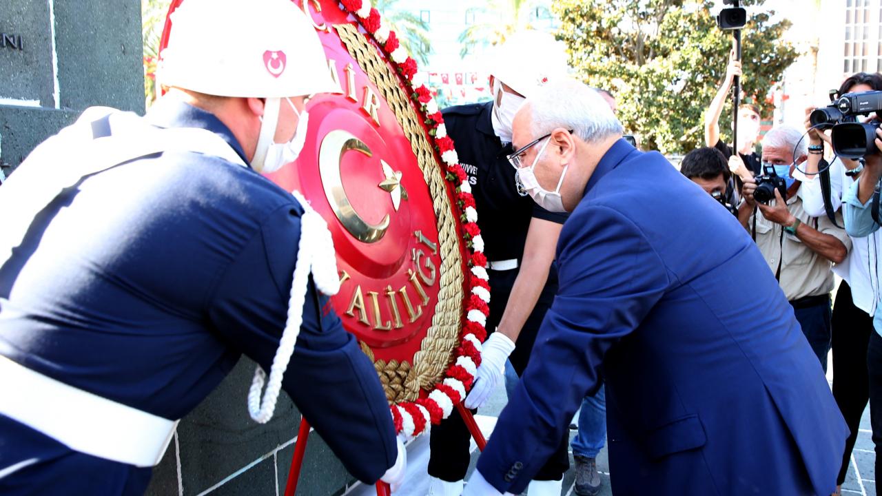 İzmir Cumhuriyet Meydanı`ndaki törende, saygı duruşu ve İstiklal Marşı`nın okunmasının ardından Vali Yavuz Selim Köşger, Ege Ordusu ve Garnizon Komutanı Orgeneral Ali Sivri ile Büyükşehir Belediye Başkanı Tunç Soyer tarafından Atatürk Anıtı`na çelenk sunuldu.