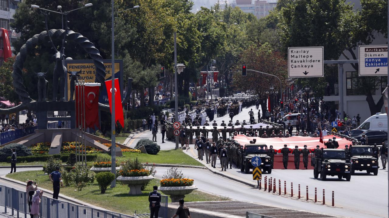 Başkentte, 30 Ağustos Zafer Bayramı`nın 99. yıl dönümü kutlamaları kapsamında, TBMM önünden Ulus`taki eski Meclis binasına kadar geçit töreni yapıldı.