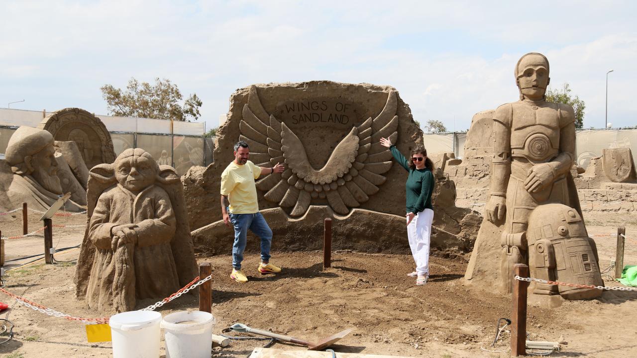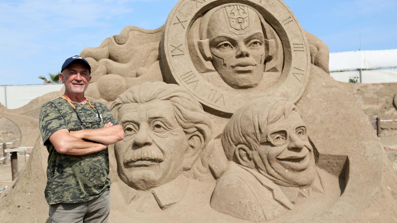 “`Zamanın Mimarları` isimli eserimizde Einstein, Stephen Hawking`in yaptığı araştırmalardan esinlenerek geleceği gördükleri ve buna ilişkin mesaj verilen bir heykelimiz var. Zamanda yolculukta unutulmayan bu tür filmler var, Back to the Future, masallarda geçen ve çok sevilen bir karakter Küçük Prens, geçtiğimiz günlerde Ay`ın en uzak noktasına uçuş yapan Orion uzay kapsülü. NASA tarafından uzaya ilk gönderilen Ham isimli şempanze. Astronomide çok önemli bir isim olan Türk-İslam bilgini El Fergani eseri yapıldı. Burada amacımız ziyaretçilerimize uzayla ilgili bilgi verirken kendi değerlerimizden de örnekler sunabilmek. Star Wars`ın Puyo ve Ardito gibi sevilen karakterleri. İlk defa Wings of Sandland karakteri oluşturduk ve kanatları altında hatıra fotoğrafı çektirebilecekler. Vostok 1 kapsülünün yarım ölçekli heykelini yaptık. 1969`da Neil Armstrong`un, uzay aracıyla ve Ay`a ayak bastığı anı canlandıran heykeli var. 10 yıl önce yaptığımız Piramit ve Sfenks ve heykeli vardı. Bu heykel üzerinde bazı değişiklikler yaptık. Firavun ve mumya ekledik. Roketler bölümü var. Uzayla alakalı yapılan çalışmalar, bilimsel araştırmalar ve önemli filmlerle ilgili eserler yapıldı ve sanatseverlerin beğenisine sunulacak. 1 Mayıs`ta ziyaretçe açılıyoruz ve 09.00- 23.00 saatleri arasında ziyaretler yapılabilecek. Gece renkli, ışıklandırılmış hali izlenebilecek. Çocuklar için de özel atölyede minik kum heykel etkinleri ile kum heykel sanatıyla tanışma fırsatı oluşacak."