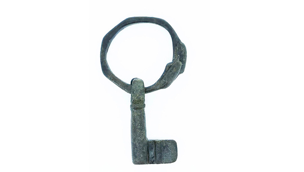 "Anahtarlı yüzüğün de kilit içerisine giren dil ve gövde kısmı, el ile tutulan yüzük kısmına geçirilmiştir. Dişli ucun bulunduğu gövde yüzük üzerine hareketli olarak eklenmiştir. Dairesel formlu halkası açık uçlu olup birer kuş başı ile son bulmaktadır. Çok özel olan eşyaların konulduğu sandığı açmak için kullanılan anahtarlı yüzük, milattan sonra 4-5. yüzyıla tarihlendirilmektedir. Söz konusu eserler kazılarda çok nadir ele geçmekte ve bölgede ilk defa karşımıza çıkmaktadır."