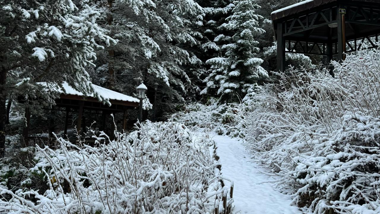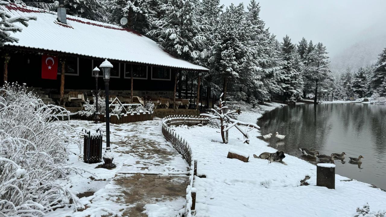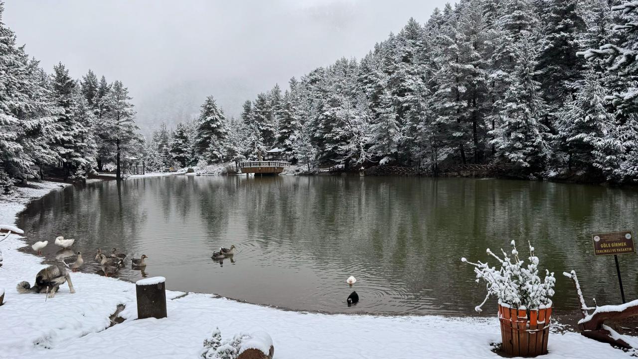 Gümüşhane'nin Torul ilçesine bağlı Zigana köyündeki doğa harikası Limni Gölü Tabiat Parkı, yağan karla beyaza büründü.