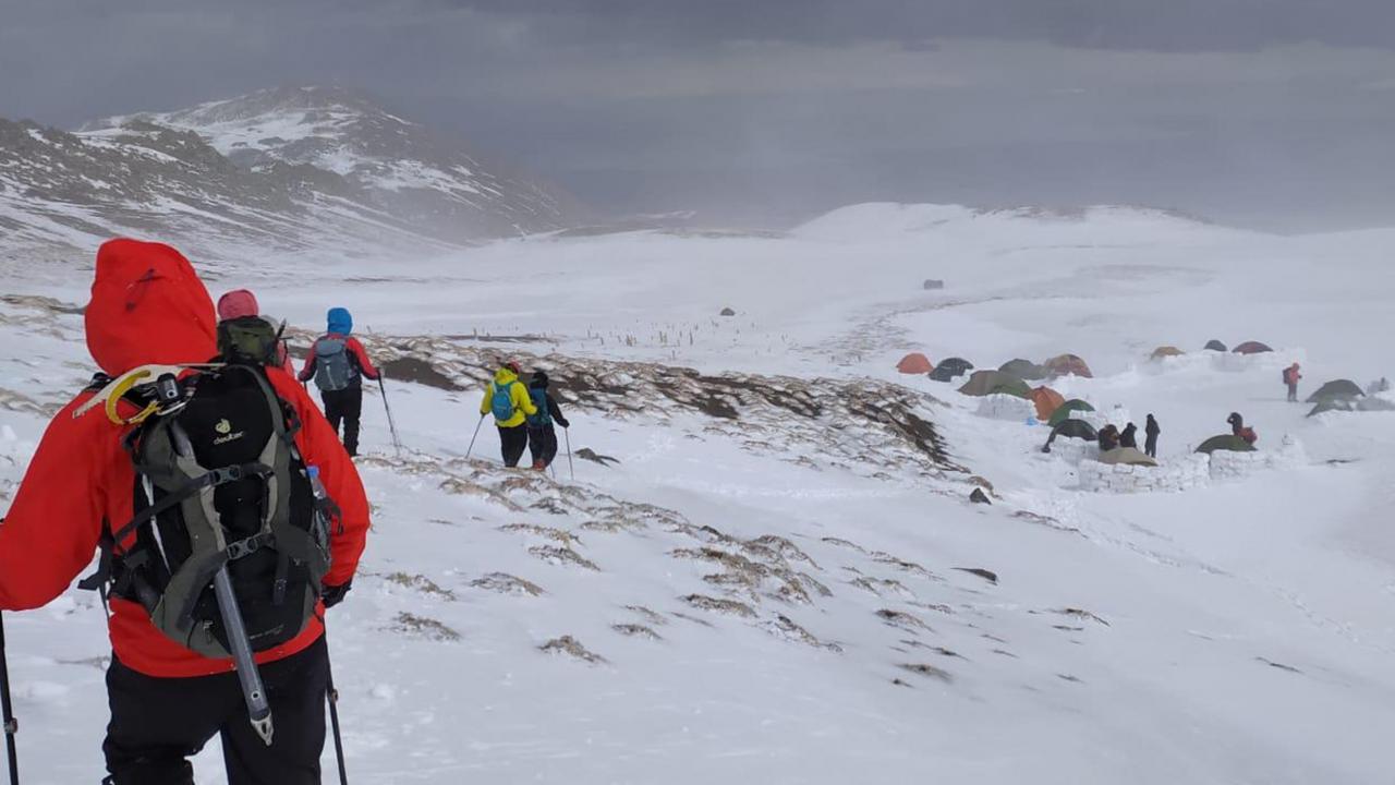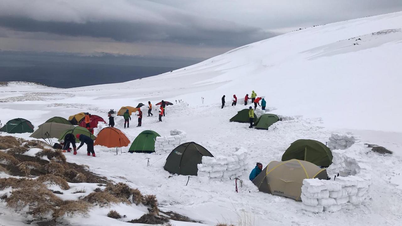 Kar yağışı altında kampı kurup, kar duvarlarıyla fırtınaya karşı önlem alan dağcılar; volkanik ve karla kaplı kamp alanından antrenörleri yönetiminde tırmanışa geçti.
