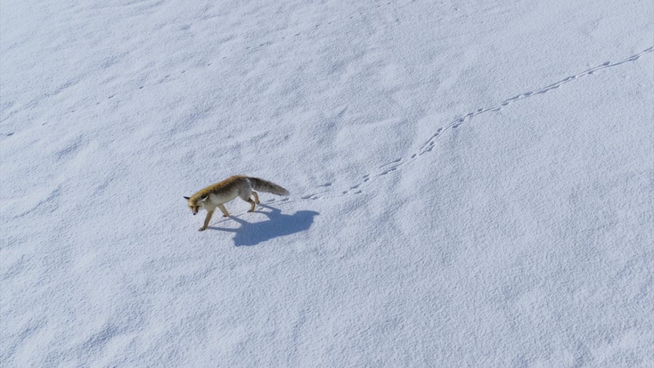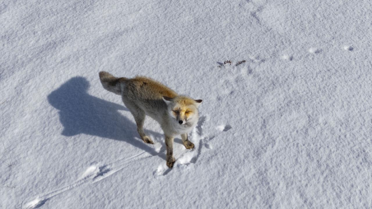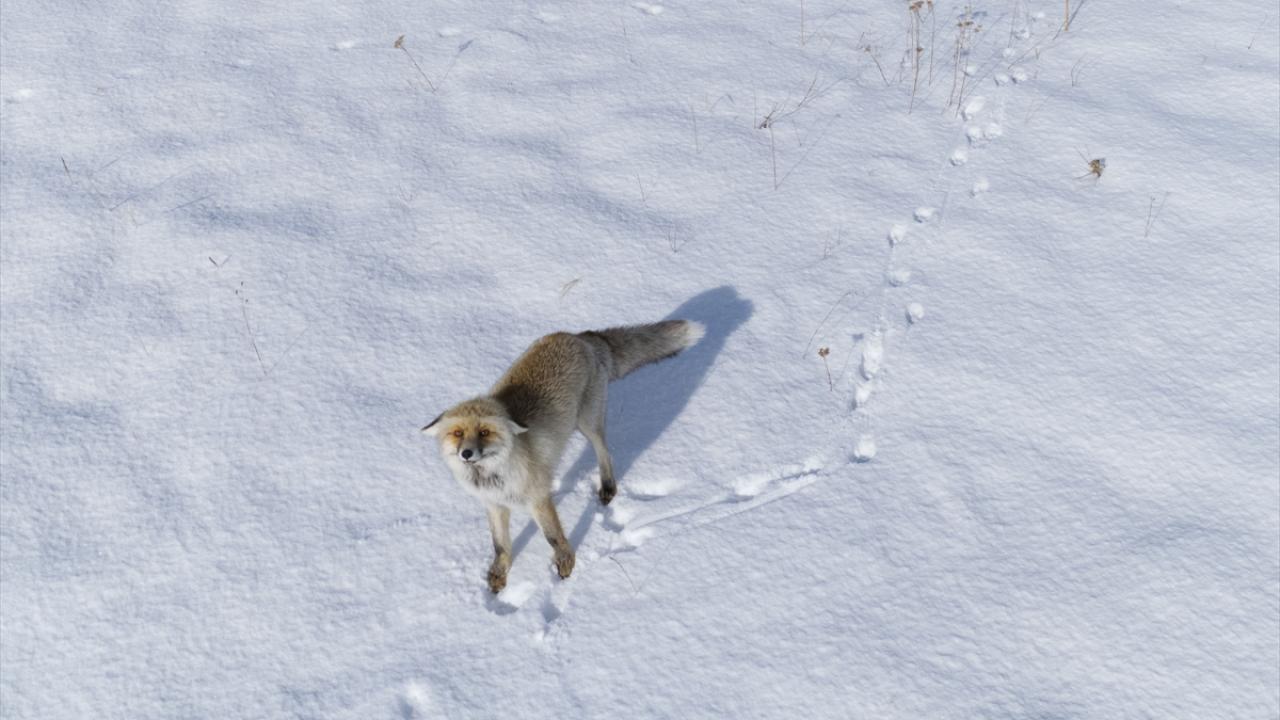 Ardından ani bir sıçrayışla, adeta havada süzülürcesine kar tabakasının üzerine atlıyor.