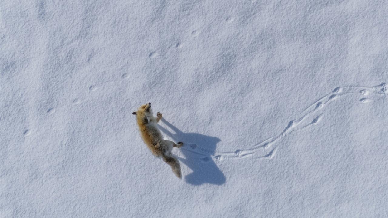 “Fare sıçrayışı” olarak bilinen bu teknikte tilki, ön ayaklarını uzatarak karı yarıyor ve avını tek hamlede yakalamaya çalışıyor.