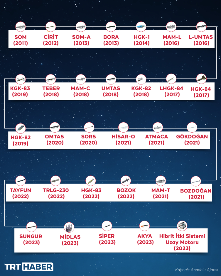[Grafik: TRT Haber]SOM 2011, CİRİT 2012, SOM-A 2013, BORA 2013, HGK-1 2014, MAM-L 2016, L-UMTAS 2016, HGK-84 2017, LHGK-84 2017, KGK-82 2018, UMTAS 2018, MAM-C 2018,TEBER 2018, KGK-83 2019, HGK-82 2019, OMTAS 2020, SORS 2020, HİSAR-O 2021, ATMACA 2021, GÖKDOĞAN 2021, BOZDOĞAN 2021, MAM-T 2021, BOZOK 2022, HGK-83 2022, TRLG-230 2022, TAYFUN 2022, SUNGUR 2023, MİDLAS 2023, SİPER 2023, AKYA 2023, Hibrit İtki Sistemi Uzay Motoru 2023 ve İnsanlı İlk Uzay Misyonu&Türk Uzay Bilim Misyonu 2024."