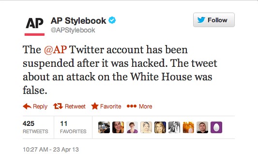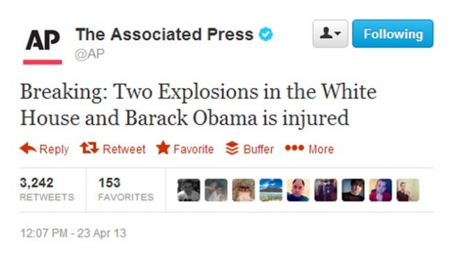 2013 yılında Twitter’da Associated Press isimli bir haber ajansının hesabından “Son Dakika: Beyaz Saray’da iki patlama oldu ve Barack Obama yaralandı” diye bir tweet yayımlanıyor ve bu tweet 5 dakikadan kısa bir sürede 4 binden fazla kez paylaşılıyor.