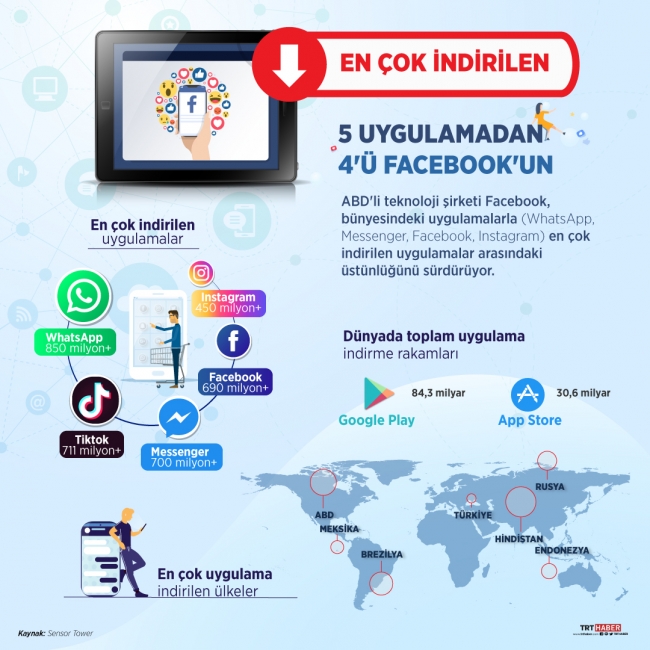 Facebook şirketi, 2016 yılından bu yana en çok indirilen uygulamalar listesinde ilk 5'te 4 uygulamasıyla yer alırken, şirketin WhatsApp uygulaması uzun yıllardır "en çok indirilen uygulama" olarak zirvedeki yerini koruyor.