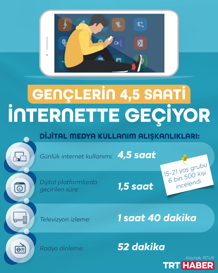 RTÜK tarafından 15-21 yaş grubundaki 6 bin 500 çocuk ve gencin katılımıyla yapılan araştırmaya göre, bu kitlenin günlük ortalama 4,5 saatini internette, 1 saat 40 dakikasını televizyon başında, 1,5 saatini dijital platformlarda, 52 dakikasını ise radyo dinleyerek geçirdiği belirlendi.