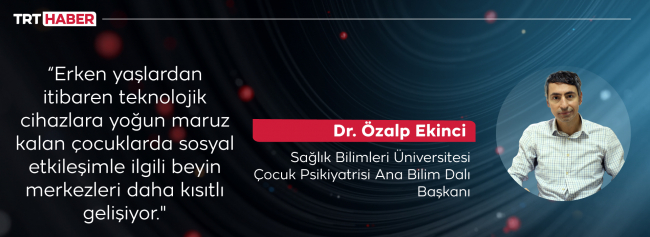 “Erken yaşlardan itibaren teknolojik cihazlara yoğun maruz kalan çocuklarda, canlı sosyal etkileşim olanakları bulmuş çocuklara göre sosyal etkileşimle ilgili beyin merkezleri daha kısıtlı gelişiyor. Özel olarak da otizm spektrum bozukluğu açısından risk altında olan olgularda sosyal bilişle ilgili beyin merkezleri yeterli düzeyde olgunlaşmıyor ekrana bağlı kalındığında.”
