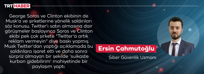“George Soros ve Clinton ekibinin de Musk'a ve şirketlerine yönelik saldırıları söz konusu. Twitter'ı satın almasına dair görüşmeler başlayınca Soros ve Clinton ekibi pek çok şirkete "Twitter'a artık reklam vermeyin" diye baskı yapmış.