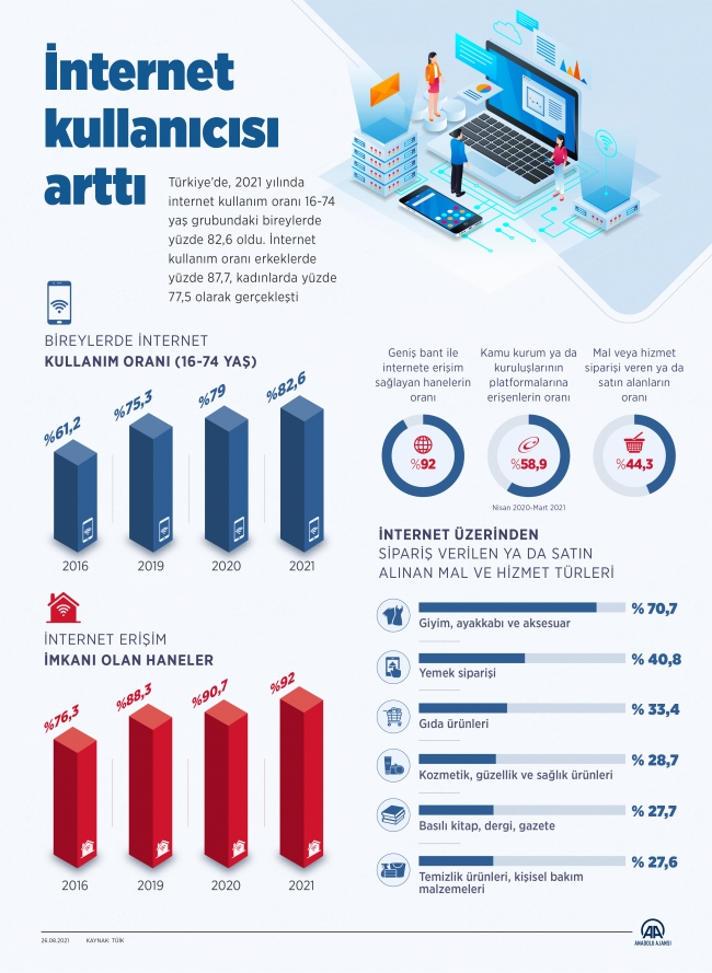 Özel amaçla kamu kurum ya da kuruluşları ile iletişime geçmek veya kamu hizmetlerinden yararlanmak için Nisan 2020 ile Mart 2021 arasını kapsayan 12 aylık dönemde interneti kullanan bireylerin oranı yüzde 58,9 oldu. Bu oran daha önce yüzde 51,5 olarak tespit edilmişti.