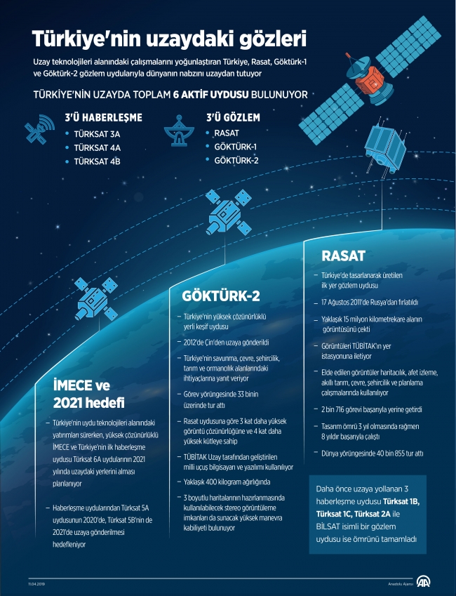 Uzay teknolojileri alanındaki çalışmalarını yoğunlaştıran Türkiye, Rasat, Göktürk-1 ve Göktürk-2 gözlem uydularıyla dünyanın nabzını uzaydan tutuyor.