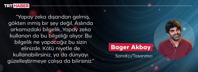 Türkiye'nin ilk yapay zeka oyuncusu Aypera da, Bager Akbay'ın tasarımında yer aldığı projelerden. Aypera'nın oyuncu olarak yer aldığı bir filmin 2022 yılında vizyona girmesi bekleniyor. Yapay zekanın geliştirdiği ürün 'sanat eseri' olur mu? Yoksa bu bir teknoloji ürünü mü? Peki ortaya çıkan eserin gerçek sahibi kim? Bu sorular sanat dünyasında son yıllarda sıkça soruluyor. Sanatçı ve tasarımcı Bager Akbay da, bu sorulara yaptığı çalışmalarla yanıt arayanlardan..."Yapay zeka arkamızdaki bilgelik" diyen Bager Akbay'ı, İstanbul'daki stüdyosunda ziyaret ettik. Hem sıra dışı projelerini, hem de yapay zekanın sanatla buluşma sürecini dinledik.