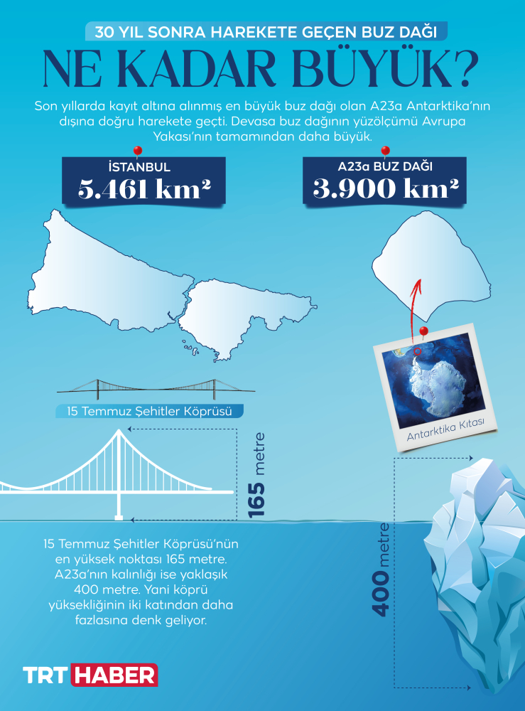 1986 yılında Antarktika kıyı şeridinden ayrılarak Weddell Denizi’nde karaya oturan A23a bir buz adasına dönüşmüştü. Geçtiğimiz yıllarda buz parçasında hareket sinyalleri tespit eden bilim insanlarının elde ettiği son verilere göre A23a, Antarktika'nın dışına doğru yeniden harekete geçti.
