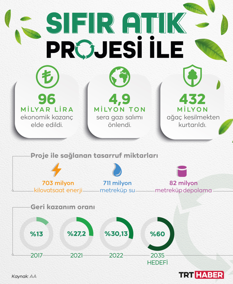Türkiye’de sıfır atık konusunda yaklaşık 19 milyon 500 bin kişiye eğitim verildi. 2017'de yüzde 13 olan geri kazanım oranı 2021'de yüzde 27,2'ye, 2022'de ise yüzde 30,13'e yükseldi. 2035'te ise yüzde 60'a çıkarılması hedefleniyor.