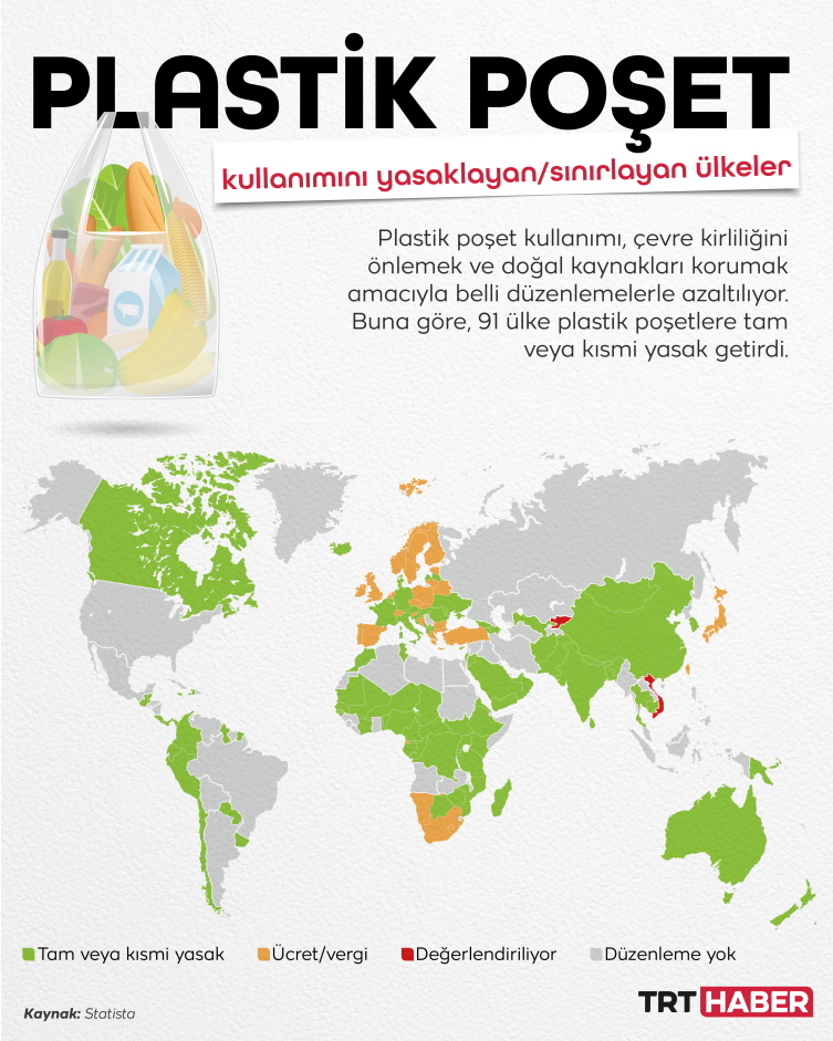 Birleşmiş Milletler raporu ve Statista’ya göre, dünya genelinde 91 ülke ve bölge, plastik poşetlere yönelik tam veya kısmi yasak uyguluyor. Plastik poşet yasakları özellikle Afrika'da popülerken, Avrupa'da çoğunlukla plastik poşet kullanımını sınırlamak için ücret veya vergi uygulamaları tercih ediliyor.