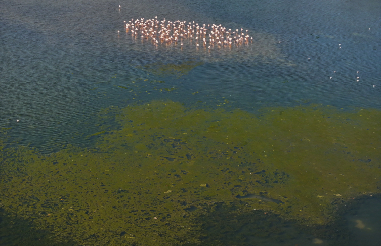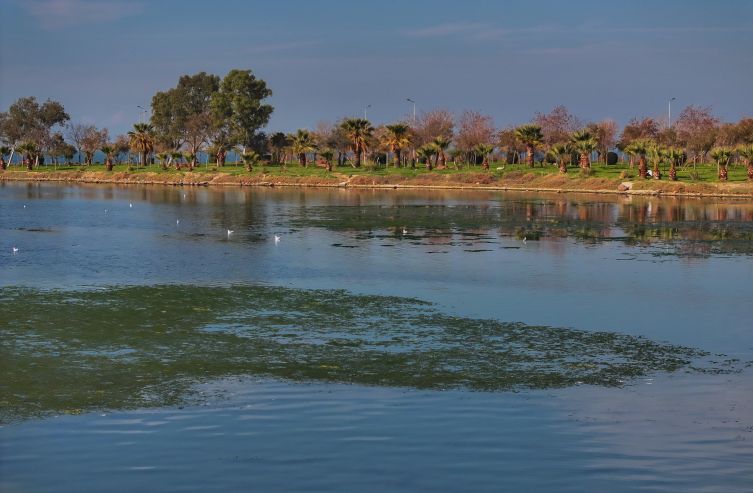 Balçova ilçesinde, flamingoların da aralarında bulunduğu birçok kuş türüne ev sahipliği yapan lagün yosun tabakası nedeniyle yeşile büründü.