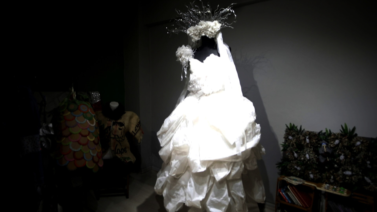 Kâğıt, metal, plastik ve tekstil atıklarından oluşturduğu kıyafet ve aksesuarlar ile geri dönüşümün öneminin altını çiziyor.