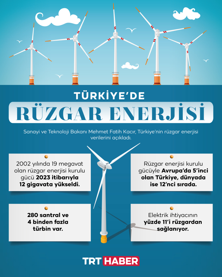 Türkiye’de kule, kanat, jeneratör, bağlantı ekipmanları üretimi yapılıyor ve 25 binden fazla kişi bu sektörde istihdam ediliyor. Rüzgar enerjisi ekipmanlarının yıllık cirosu 1,5 milyar euroyu aştı ve üretimin yüzde 75’i yurt dışında, 52 ülkeye ihraç ediliyor.