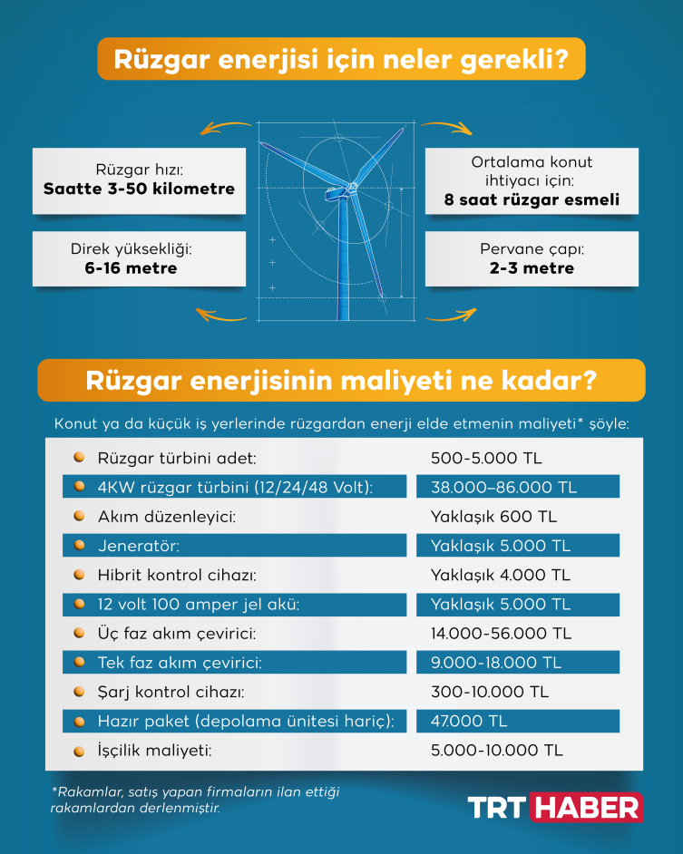 Özellikle otomotiv sektörünün elektrik motorlu ağırlıklı olmaya başlamasıyla birlikte elektrik ihtiyacı daha fazla artacak. Bu ihtiyaca çevreci çözümlerden biri de rüzgar enerjisi olacak. Rüzgar enerjisinden, sadece büyük santraller kurarak değil, küçük bir türbin ve depolama gibi ünitelerle evde ve küçük iş yerlerinde faydalanmak da mümkün. Bunun için gerekli rüzgar ise saatte 3 kilometrelik bir hız. Özellikle yüksek bölgeler, yağışların rüzgara neden olduğu yerler, sürekli rüzgar alan vadiler, rüzgar kesici yapıların bulunmadığı meskun mahallerde, türbin yerleştirmek için uygun alan bulunması durumunda rüzgardan yararlanmak mümkün.
