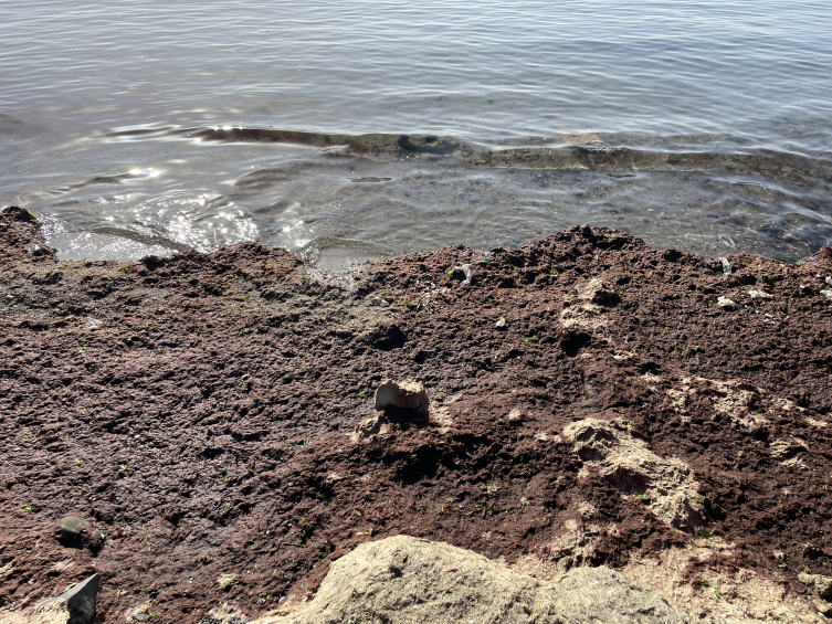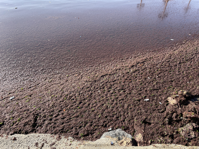 Sahildeki bazı alanlar da kırmızı yosunla kaplandı.