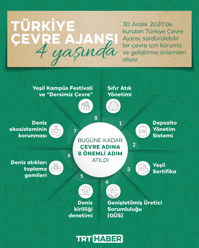 Türkiye Çevre Ajansı, 30 Aralık 2020’de yürürlüğe giren kanunla kuruldu. Çevre, Şehircilik ve İklim Değişikliği Bakanlığı tarafından belirlenen çevre strateji ve politikaları doğrultusunda faaliyetler yapan Çevre Ajansı, Sıfır Atık yaklaşımı doğrultusunda kamuoyunda farkındalık oluşturma, yeşil alanların korunması ve Depozito Yönetim Sistemi kurulması vizyonuyla geride kalan 4 yılda 8 önemli hedefi gerçekleştirmeyi başardı.