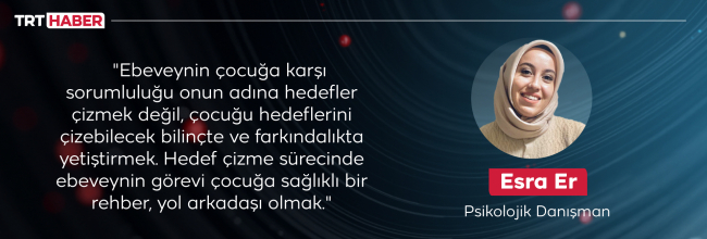Psikolojik Danışman Esra Er, "Ebeveynin çocuğa karşı sorumluluğu onun adına hedefler çizmek değil, çocuğu hedeflerini çizebilecek bilinçte ve farkındalıkta yetiştirmek. Hedef çizme sürecinde ebeveynin görevi çocuğa sağlıklı bir rehber, yol arkadaşı olmak" diyor.