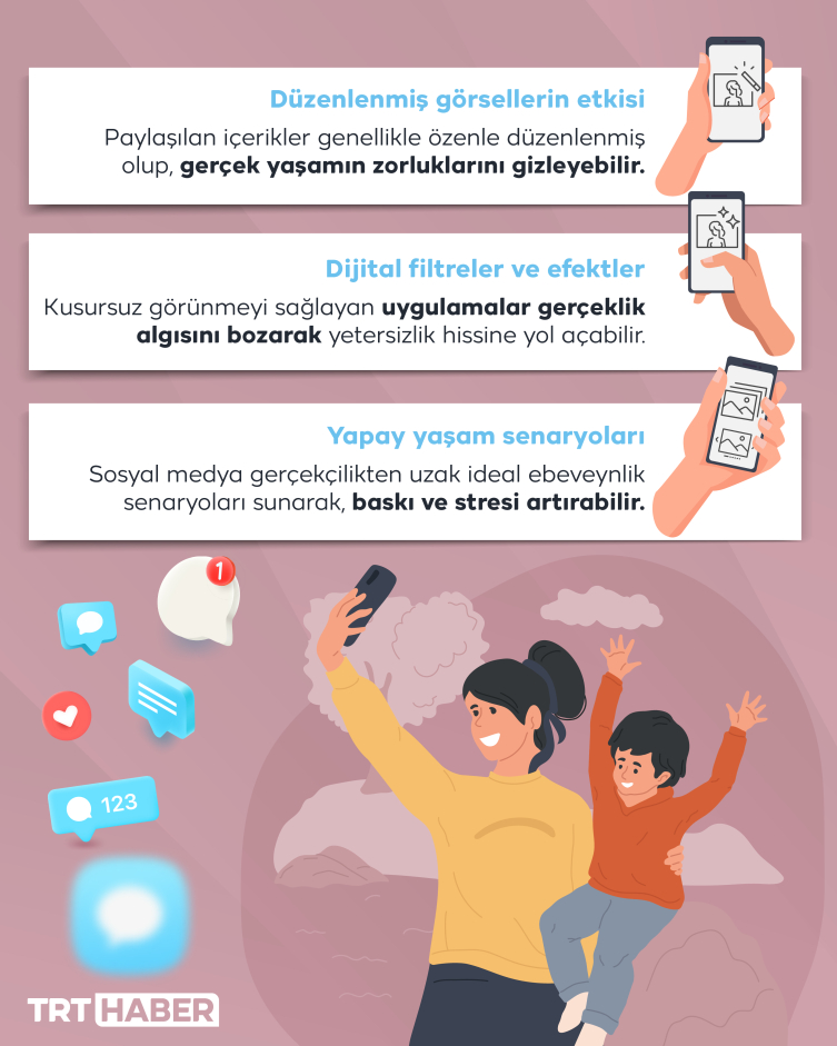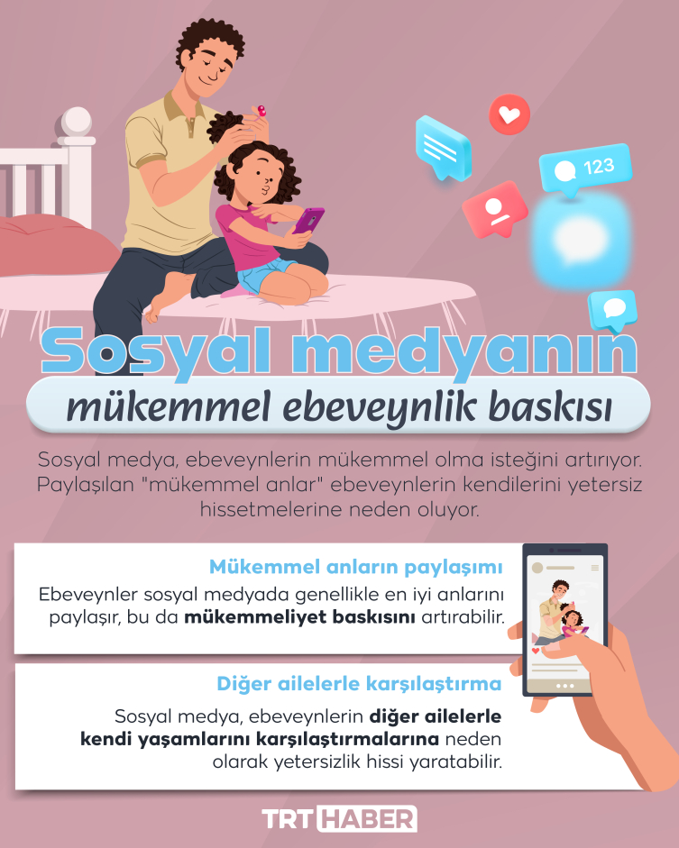 [Grafik: TRT Haber]Kusursuz aileler, yaşamlar... Sosyal medya insanların mükemmel anlarının bir toplamı gibi... Ancak yine de insanlar bu mecralarda gördükleri yaşantılardan fazlasıyla etkilenebiliyor. Sosyal medya bu yönüyle ebeveynleri sürekli olarak "mükemmel" olma çabası içine sokuyor. Bu durum da anne-babaların yetersizlik hissi yaşamalarına neden oluyor.