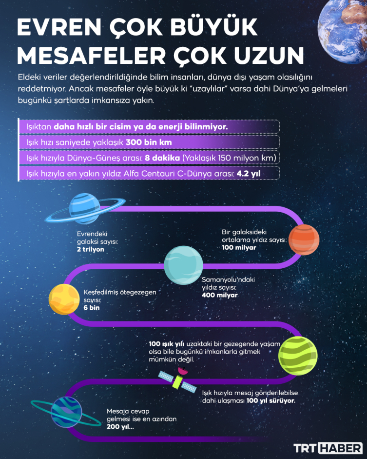 Bilinen evrende yaklaşık 2 trilyon galaksi var. Her birinde ise ortalama 100 milyar yıldız olduğu tahmin ediliyor. Güneş Sistemi ve Dünya’nın içinde bulunduğu Samanyolu galaksisinde 400 milyar yıldız bulunuyor. Ayrıca Samanyolu içinde 6 bin civarında ötegezegen var. Bu yüz milyarlarca yıldız ve ötegezegen içinde yaşam olup olmadığı henüz bilinmiyor. Derman, “Bunlar içinde yaşam bulunması olasılığı çok yüksek. Şu anda bilim dünyası ‘o yaşamı nasıl buluruz’ sorusu ile uğraşıyor. Bulursak da çok yakınımızda, ‘100 ışık yılı’ uzaklıkta bir gezegende bulabileceğiz ve ne onlar bize gelebilecek ne biz onlara gidebileceğiz…” diyerek yine mesafelere dikkat çekiyor. Uzayda yaşam bulunursa onlarla en fazla haberleşilebileceğini belirten Derman, Dünya’dan ışık hızıyla gönderilen mesajın 100 yıl sonra onlara ulaşacağını, 200 yıl sonra da cevabının geleceğini ifade ediyor ve ekliyor: