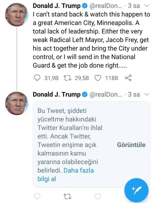 Bir de üstüne Trump'ın Floyd protestocularına "haydut" dediği ve "Yağma başladığında silahlar ateşlenir" ifadesini kullandığı tweet'inin, akış sayfasında doğrudan görüntülenmesi engellendi. Platformun "Göster" butonu eklediği uyarı notunda, "Bu paylaşım, şiddeti yüceltmeye yönelik Twitter kurallarını ihlal etmiştir ancak Twitter, kamu yararının söz konusu olduğunu değerlendirdiğinden paylaşımı erişime açık bırakmıştır" denildi.